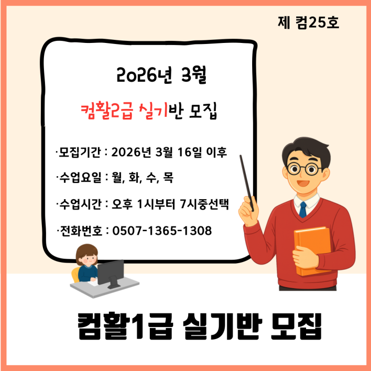 김해에서 컴퓨터활용능력 1급 실기 수업을 찾고 계신가요? 2026년 3월부터 컴활 1급 실기 과정을 준비하려는 분들을 위해 김해 삼계동에 위치한 경남컴퓨터학원에서 실습 중심 수업을 진행합니다. 초보자도 이해할 수 있도록 기초부터 차근차근 실기 위주로 수업이 이루어지며, 자격증 취득을 목표로 체계적으로 준비할 수 있습니다. ☑️2026년 3월 컴활 1급 실기반 일정 안내 김해 컴퓨터학원인 경남컴퓨터학원에서 진행하는 2026년 3월 컴활 1급 실기 수업은 2026년 3월 16일 이후부터 시작 가능합니다. 수업은 월요일부터 목요일까지 운영되며, 오후 1시부터 7시 사이 중 개인 일정에 맞는 시간을 선택하여 수강하실 수 있습니다. ☑️김해 컴....... <img src="https://blogthumb.pstatic.net/MjAyNjAzMTRfMTkz/MDAxNzczNDk2NDY0NTA4.15EJSaQ1EoZuCubx7M6xwJrQViKWqJknN3qSPfGeujog.rwVCHIhAP5oCidgWK6IqVmNpuj13VRMitjnwCo_QxrUg.PNG/%B1%E8%C7%D8_%C4%C4%C8%B0_1%B1%DE_%BD%C7%B1%E2__2026%B3%E2_3%BF%F9_%BC%F6%BE%F7_%C0%CF%C1%A4_%BE%C8%B3%BB.png?type=s3" />