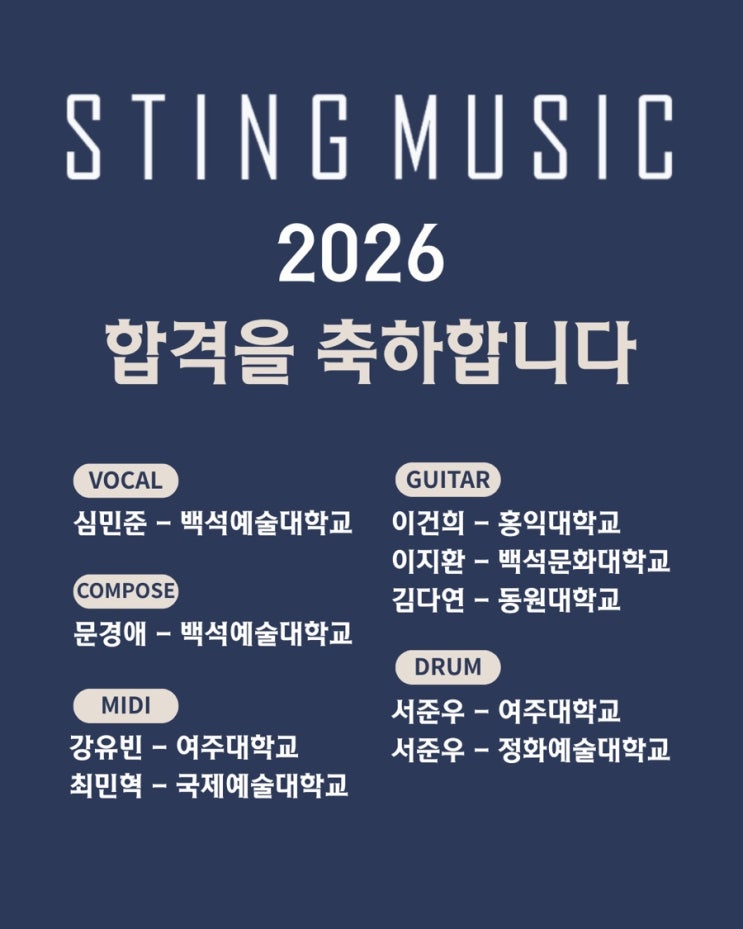 기다리고 기다리던 스팅실용음악학원 2026학년도 입시 결과입니다! 치열한 경쟁률을 뚫고 당당히 합격의 영광을 안은 우리 스팅이들 명단을 공개합니다 실용음악 입시는 단순히 연주와 노래 실력뿐만 아니라 입시장의 분위기를 압도하는 자기만의 색깔이 정말 중요합니다! 이번에 합격한 학생들은 입시 준비 기간 동안 매일같이 저와 함께 퇴근하는 학생들이었습니다 입시 기간 중간에 찾아온 슬럼프도 선생님들과의 1:1 상담과 피드백을 통해 멋지게 극복해냈기에 이번 합격이 더욱 값지게 느껴집니다 저희 스팅실용음악학원만의 합격 노하우는? 많은 분이 스팅에서 합격생이 끊이지 않는 이유를 물어보십니다....... <img src="https://blogthumb.pstatic.net/MjAyNjAyMjRfMTM0/MDAxNzcxOTMwMTk3ODYx.gpf-DaHcvWA6J6mNlja9PwnNAbmiLF6lviQOieVa_9gg.YjreoF9R-zuJ1Q2XXs_qzGcSZhT0uSM4kQmKZ-AgIhIg.JPEG/IMG%A3%DF7480.jpg?type=s3" />