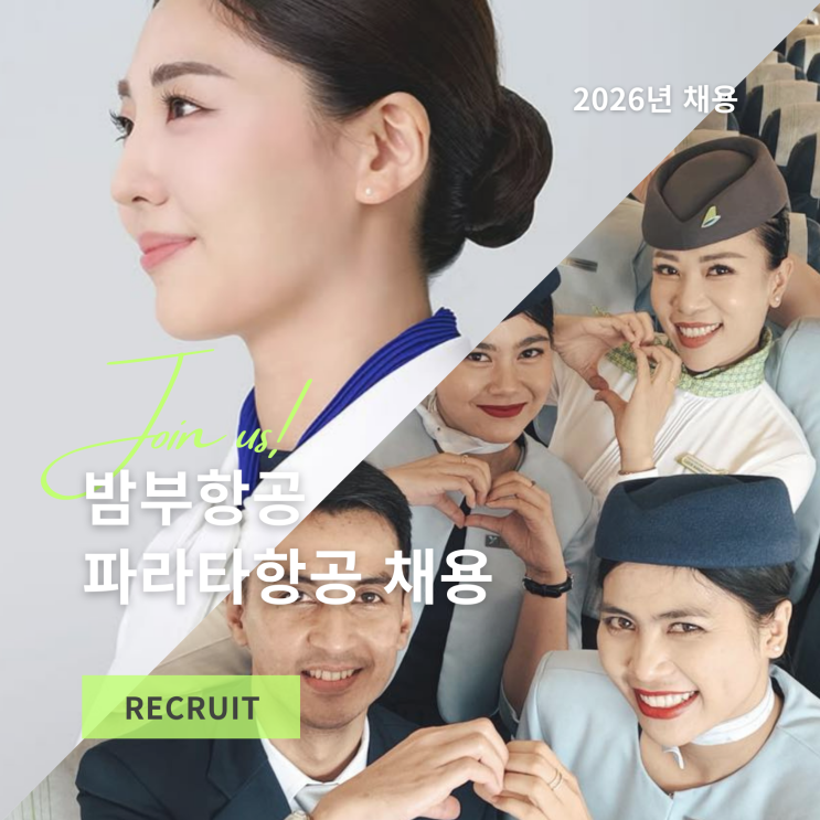 안녕하세요. 윙스토리입니다. 오늘은 파라타항공과 밤부항공 채용 소식을 전달 드릴 텐데요! 먼저 밤부항공은 윙쓰분들께서 대거 합격하셨었던 베트남 베이스의 항공사입니다. 2019년 4월 7일 하룽 오픈데이 최종합격 2019년 4월 21일 하노이 오픈데이 최종합격 윙쓰분들께서는 지난 2019년 현지인 하룽, 하노이 오픈데이에서 최종 합격하셨습니다. 코로나 시기였음에도 불구하고 휴직 없이 근무할 수 있도록 항공사 측에서 굉장히 배려하고 노력했다고 합니다. 그 이후 무서운 속도로 성장하고 있는 밤부항공입니다! 그런 밤부항공에서 또 채용이 시작되었으니 윙스토리에서도 움직여야 하겠죠! :) 2026년 밤부항공의 첫 상반기 채용을 살펴보겠....... <img src="https://blogthumb.pstatic.net/MjAyNjAyMjBfMTMz/MDAxNzcxNTc2MzUzNjM0.X9Gdwp7aoofkqQYGZ7PslyDgOjrQSkt798JF5SYpjcog.F1Bnnwdqf-GpUUewvKEGxGM1bvPUB4KtIDRx8XjL708g.PNG/%B9%E3%BA%CE%C7%D7%B0%F8%C6%C4%B6%F3%C5%B8%C7%D7%B0%F8%C3%A4%BF%EB.png?type=s3" />