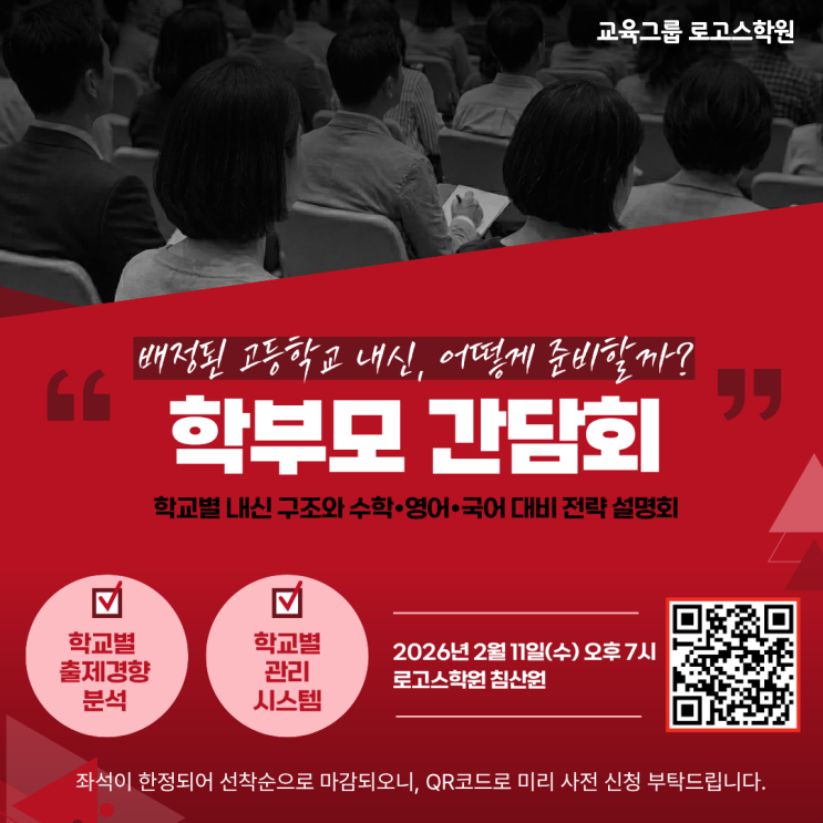 학교별 내신 구조를 정확히 이해하는 학부모 간담회 안내 고등학교 배정 발표 이후, 많은 예비 고1 학부모님들께서 비슷한 고민을 하십니다. “배정된 학교 내신은 어떤 구조일까?” “중학교와 무엇이 달라질까?” “지금부터 무엇을 준비해야 할까?” 고등학교 내신은 학교별로 출제 경향, 평가 방식, 관리 포인트가 다르기 때문에 막연한 정보보다는 학교에 맞는 정확한 이해가 무엇보다 중요합니다. 왜 ‘학교별 내신 이해’가 중요한가요? 고등학교 내신은 단순히 ‘열심히 하면 된다’로 접근하기 어렵습니다. 같은 과목이라도 학교별 시험 난이도와 유형이 다름 서술형·수행평가 비중과 방식 차이 교과서 외 부교재 활용 여부 차이 중간·기....... <img src="https://blogthumb.pstatic.net/MjAyNjAxMjlfMTQg/MDAxNzY5NjgwMDY1NjMz.4SPYfiCSAkcDvb5agbeV3GZQSHOZWD9Vr49Sdkt5c28g.c-r4Vebp6woDFsOEWfINfqsE9aC7at-VOrFIMqMBaoEg.PNG/image.png?type=s3" />