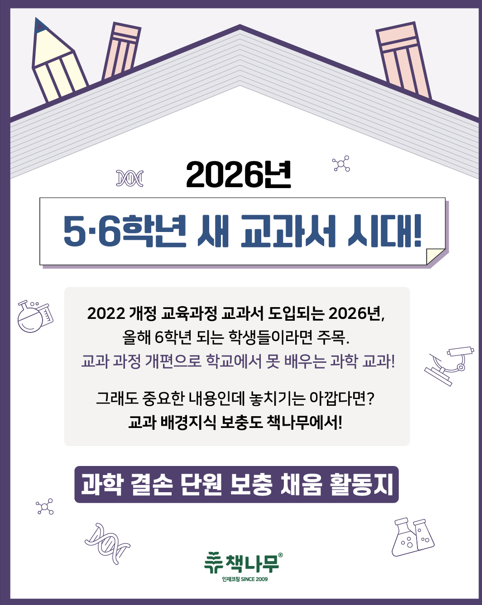 2026년 6학년이 다뤄야할 중요한 내용들 중에서 과학! 초6.과학 교과 과정에서 배우던 내용들이 이제는 다루지 않는 부분으로 바뀐 부분이 있습니다. 2022 교과과정 개정이 적용되어 2026년 6학년 교과 내용이 달라집니다. 일부 과학에서 중요하게 다루던 내용들이 개정되면서 초4,5학년 과정으로 이동하게 되었는데요~ 그럼 우리 초6 친구들은 공백을 두고 그냥 교과수업을 따라가도 과연 괜찮을까요? 낯선 과학용어들과 개념들로 더욱 어렵다고 느낄 수 있습니다. 그래서 책나무는 이러한 교과 공백을 채우기 위해 결손 단원을 채우기위한 활동지 수업을 진행합니다. 개정되는 교육과정에 맞추고 우리 아이의 수준과 이해에 중점을 두고 1:1맞....... <img src="https://blogthumb.pstatic.net/MjAyNjAyMDRfMzAw/MDAxNzcwMjEzNjY4MjU0.FnyvWCmIsxY5BMaoMWeFJinjLPyKId119Kaa2OXaCGIg.G1snHLUrtPrddGo0C_0lxNaxjCuI-89Y_POi-jgZnoog.PNG/1770213246264.png?type=s3" />