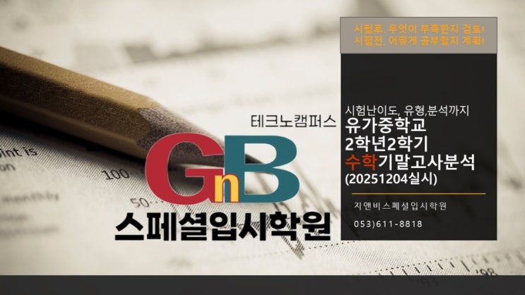 유가중학교 2025년 2학년 2학기 수학 기말고사 분석 안녕하세요. 유가읍 영어수학 지앤비스페셜입시학원입니다. 2025년 12월 4일 실시된 유가중학교 2학년 2학기 수학 기말고사를 기준으로 ✔ 시험 난이도 ✔ 문항 유형 ✔ 단원별 출제 특징 ✔ 시험 이후 학습 방향 을 체계적으로 정리해드립니다. 시험은 끝났지만, 시험 후 분석이 곧 다음 성적을 결정합니다. 무엇이 부족했는지 점검하고, 다음 시험을 어떻게 준비해야 할지 함께 살펴보겠습니다. 문항 수 · 점수 배점 분석 이번 유가중학교 2학년 2학기 수학 기말고사는 선택형(객관식) 16문항 / 서술형 4문항으로 구성되었습니다. •선택형 : 총 60점 · 3점 7문항 · 4점 6문항 · 5....... <img src="https://blogthumb.pstatic.net/MjAyNTEyMThfMTg3/MDAxNzY2MDYwNjk3ODM5.um3XmFFekeKY4ZMQ0h45mxP9pxVxnKTBjzsNkETPS40g.d3fu32EOMTOCIvEPrxPqB8dM_jETe2Lt--rrD269vGkg.JPEG/IMG%A3%DF3905.jpg?type=s3" />