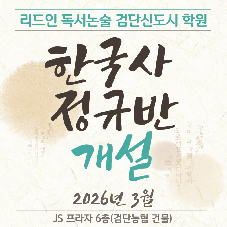안녕하세요, 검단 논술학원 리드인 독서논술 검단신도시 학원입니다. 2026년 새학기를 맞이해 3월부터 초등 5~6학년 대상 한국사 정규반을 개설합니다. 왜 지금, 한국사일까요? 한국사는 중등 내신과 고등 내신에서 중요도가 높은 과목이면서, 또한 수능 필수 과목이기도 합니다. 중학교 3학년부터 본격적으로 시작되는 한국사 수업. "역사는 암기 과목"이라는 편견 때문에 많은 학생들이 어려움을 겪습니다. 실제로 중3 한국사 내신을 별 생각없이 준비하다 낭패를 보는 학생들이 많습니다. "갑자기 외울 게 너무 많아요" "왕 이름이 다 비슷해서 헷갈려요" "시대 순서가 뒤죽박죽이에요" 뿐만 아니라....... <img src="https://blogthumb.pstatic.net/MjAyNjAyMjJfMTA4/MDAxNzcxNzYzMzIzNzQ1.xk6gXOM86Kg3OD1pLLQ6y8bQcCImNos876uCcRBl-awg.zXFB_14PMVfg13Tj5g6YdZB_3ZKLlOX916Wgodvg65Ag.PNG/1.png?type=s3" />