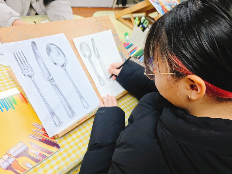 파스타 그리기 접시에 담겨있는 맛있는 파스타 그리기 파스타 면은 물감으로 접시위에 올라가는 커틀릿 세트는 연필 소묘로 파스타 재료는 색연필로 다양한 재료들로 그리기 했어요. 포크와 나이프 스푼 형태를 관찰하며 연필로 그리기 포크 그리기를 제일 어려워 하네요. 유치원생들도 언니 오빠들 처럼 그려 본답니다. 언니 오빠들은 연필로 명암을 표현 하지만 유치원 동생들은 싸인펜이나 색연필로 채색 했어요. 구불구불 파스타 면을 평붓을 이용하여 그려 보아요. 파스타에 들어가는 여러가지 재료들을 색연필 사인펜등을 이용해서 그려줘요. 토마토,베이컨,버섯,햄,민트잎 취향에 맞게 골라서 예쁘게 그리고 면 위에 잘라 붙여 준답니다. ....... <img src="https://blogthumb.pstatic.net/MjAyNjAyMjVfMTQg/MDAxNzcyMDA1MTYwNTEy.ED3uNdsPi-0rZyEOVYoKjjwAojxkO7VWDFCbvPtXRlYg.It7I_ZNRrKlU2dvQzI_OLBa4X0B99Xece09cu95yyV8g.JPEG/2026-01-14-14-44-14-647.jpg?type=s3" />