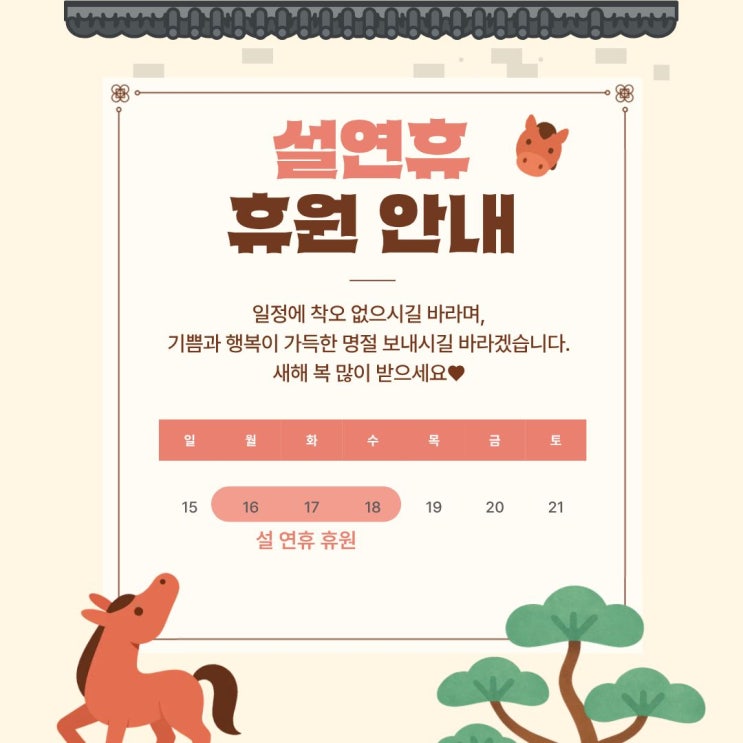 안녕하세요! #로이발레학원 입니다. 2026년의 시작이 얼마 안된 것 같은데 벌써 2월 설 명절이 코앞으로 다가왔네요! 설 연휴 16일 (월) ~ 18일 (수) 까지 휴원으로 일정에 착오 없으시길 바라겠습니다. 기쁨과 행복이 가득한 명절 되시길 바라며 새해 복 많이 받으세요♥ <img src="https://blogthumb.pstatic.net/MjAyNjAyMTBfMTc2/MDAxNzcwNzE5MjI0OTQ5.XZlLV4OYb7M9uRxLVxAHtAEFr4eOaoSbpRRHri_CfnEg.jlkX5BDC686QXaHubnIrY55r1ughqDtiNoWNztxRRAEg.JPEG/2026_%BC%B3_%BF%AC%C8%DE%BE%C8%B3%BB.jpg?type=s3" />