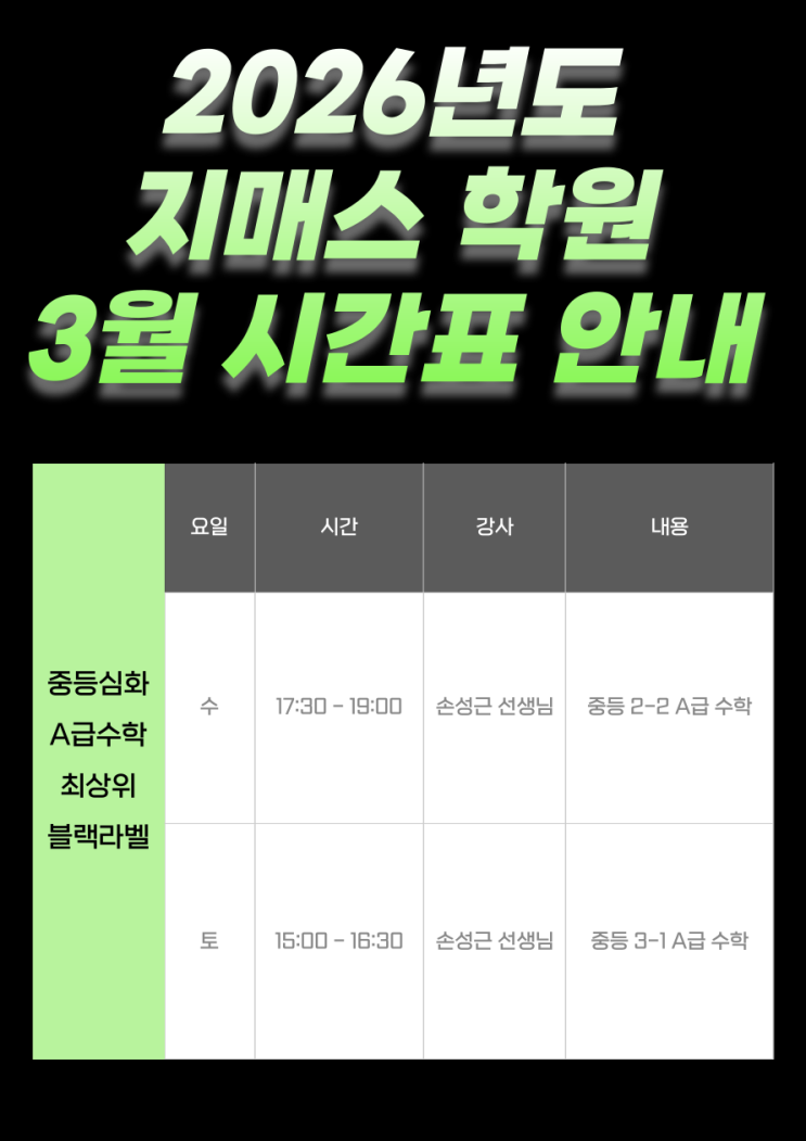 #지매스수학과학학원 #지매스수학학원 #지사이언스과학학원 #지매스지사이언스학원 #대전수학학원 #대전과학학원 #둔산동수학학원 #둔산동과학학원 #탄방중수학학원 #삼천중수학학원 #문정중수학학원 #둔원중수학학원 #만년고수학학원 #충남고수학학원 #도안고수학학원 #둔산여고수학학원 #서대전고수학학원 #서대전여고수학학원 #대전여고수학학원 #충남여고수학학원 안녕하세요, 지매스&지사이언스 수학과학학원입니다! 2026년 3월 시간표 입니다 :) 상담 문의 및 학원 문의는 042-472-4080으로 전화주시면 자세한 상담이 가능합니다. 상담문의 지매스 & 지사이언스 학원 ( 042-472-4080 ) -> 밴드에 가입하시면 더 빠른....... <img src="https://blogthumb.pstatic.net/MjAyNjAyMjNfMjc3/MDAxNzcxODQzMzQ2Nzc0.WNSqE6SxBaH_vwLxgvnex9lUJsfiRJZqK1Yxzi9aEh0g.f9EQY8--8AU73zC3_KZTFtvR3UQOPDk89DsHW34FMWsg.PNG/001.png?type=s3" />