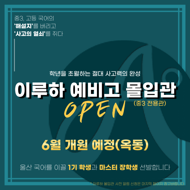 안녕하세요! 울산 국어 교육의 좋은 동반자, 이루하 국어입니다. 중학교 3학년, 고등학교 진학을 앞두고 급격히 어려워지는 국어 과목 때문에 고민이 많으실 텐데요. 단순한 암기나 '해설지'에 의존하는 공부로는 고등 국어의 벽을 넘을 수 없습니다. 이제 해설지를 버리고 '사고의 열쇠'를 쥘 때입니다. 학년을 초월하는 절대 사고력의 완성! 오직 중3만을 위해 모든 역량을 집중한 [이루하 예비고 몰입관]이 오는 6월, 옥동에 오픈합니다! 8개월의 여정, '임계점'을 돌파하다 이루하 20년의 열정과 노하우의 결정판을 단 8개월의 여정으로 압축했습니다. 우리 아이들이 스스로 만들어 낸 한계를 깨고....... <img src="https://blogthumb.pstatic.net/MjAyNjAyMjRfMjQ5/MDAxNzcxOTEyNTAxNDcy.qRRlIgM2r3-RLwL0BbcKZUFfrIpL687R1GdsyGaf3D4g.xYOYAm2mH5gBtX02sAtusd71x-oIRKpqMrw3HhLYtYIg.PNG/3.png?type=s3" />