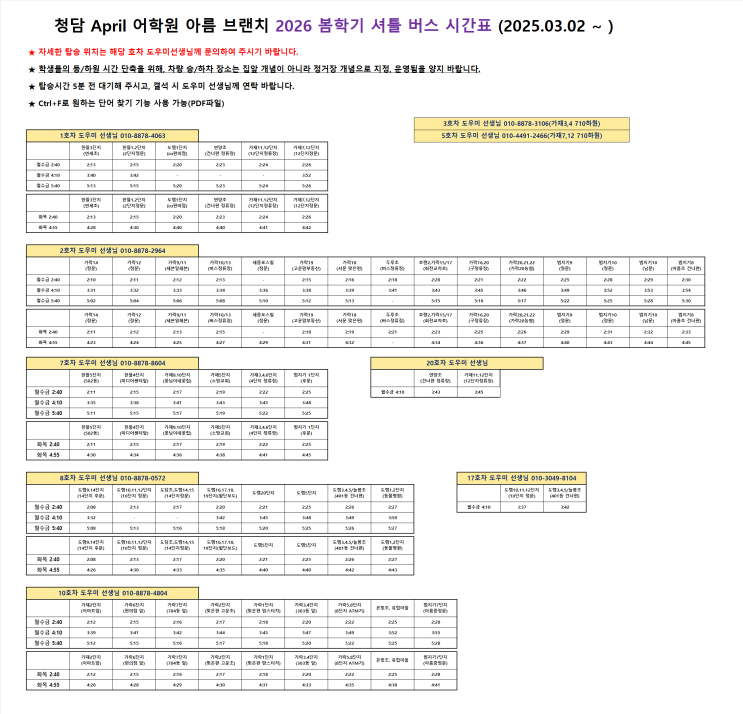 [청담April 세종아름] 2026 봄학기 셔틀 시간표