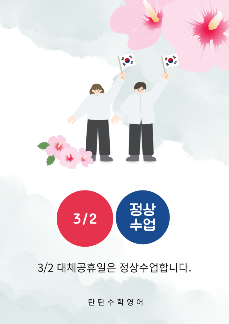 탄탄수학학원 3월 학사일정 안내 3월 2일 정상수업 진행합니다 안녕하세요 읽고, 쓰고, 말하는 수학 학습 탄탄수학학원입니다. 설렘 가득한 새 학기가 시작되었습니다. 3월은 한 해의 학습 방향을 결정하는 아주 중요한 시기입니다. 3월 학사일정을 안내드리니 참고 부탁드립니다. 3월 2일 정상수업 안내 ✔ 3월 2일(월) 정상수업 진행 공휴일 여부와 관계없이 학원은 정상수업으로 운영됩니다. 수업 시간에 맞춰 등원해 주세요 3월 학사 운영 안내 ✔️신학기 1학기 진도 시작 3월부터 신입생 1학기 과정이 본격적으로 시작됩니다. 개념을 정확히 이해하고, 문제 해결 과정을 말로 설명하는 연습까지 진행합니다. ✔️학습 진단 및 반....... <img src="https://blogthumb.pstatic.net/MjAyNjAyMjdfMjIg/MDAxNzcyMTQ4NTUxMTUz.1tSvcen4tawarv7yR7TWOAUvVx3v1XreyXKzFKTPSX0g.vYOQqKmKF9w1-R21VYmUqimRFvpK_LHB8lV7dJ4g3e8g.PNG/900%A3%DF1770875997230.png?type=s3" />