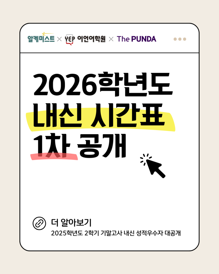 안녕하세요, 이언어학원입니다. 다가오는 2026학년도 1학기 중간고사를 대비하여 이언어학원 내신 대비 1차 시간표를 공개합니다. 내신은 단순한 시험 준비가 아닌, 학교별 맞춤 전략을 기반으로 한 지속적인 학습의 흐름 속에서 만들어집니다. 이언어학원은 매 학기 중간고사와 기말고사를 하나의 내신 대비 과정으로 보고, 학교별 출제 경향을 분석하여 맞춤형 학습 전략을 설계해 왔습니다. 이번 1차 시간표 역시 다가오는 중간고사 준비를 위한 이언어학원의 내신 대비 방향을 담고 있습니다. 그리고 이러한 준비가 실제 기말고사 성과로 어떻게 이어졌는지, 2025학년도 2학기 기말고사 결과를 통해 함께 확인해 보시기 바랍니다. 이언어학원....... <img src="https://blogthumb.pstatic.net/MjAyNjAyMjZfOTIg/MDAxNzcyMTEwNjA5MDU0.YICg19fx8fIHixCr7xpwKU9BAK1NwJQH4aNgNdKP2fkg.5FjK6FU1MtPV0VPw0Dnl1h5xRBomv10tDsk4-wB7RWcg.PNG/%BD%E6%B3%D7%C0%CF_2026%C7%D0%B3%E2%B5%B5_%B3%BB%BD%C5_%BD%C3%B0%A3%C7%A5_1%C2%F7_%B0%F8%B0%B3.png?type=s3" />
