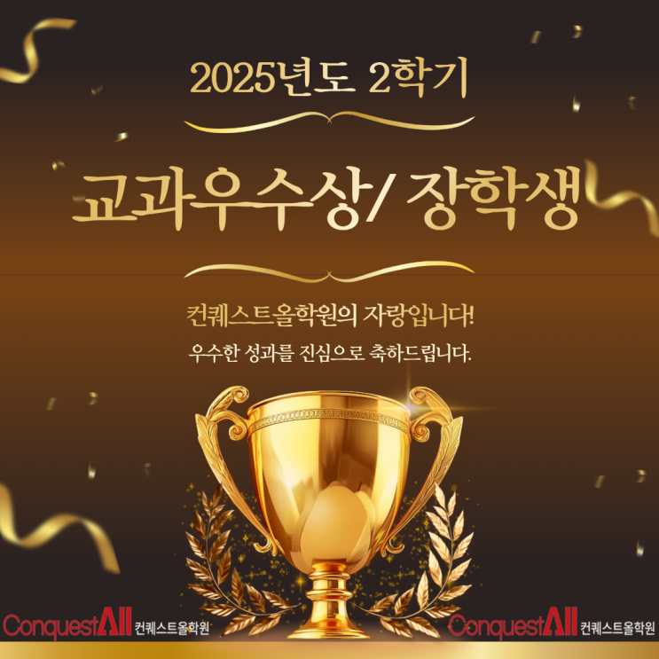 안녕하세요! 입시총괄센터 컨퀘스트올학원 센터장입니다 이번 2025학년도 2학기 기말고사, 우리 학원 친구들이 정말 자랑스러운 결과를 만들어냈습니다. 말이 필요 없는 결과부터 말씀드릴게요. 교과우수상 다수 수상 이번 기말고사에서 우수한 성적을 거둔 학생들이 학교로부터 교과우수상을 수상했습니다. 단순히 한 과목 잘 본 게 아니라 전반적인 성취도와 꾸준함이 만들어낸 결과입니다. 장학증서 & 장학금 수여 그중에서도 2명의 학생은 장학증서와 함께 장학금까지 수여받았습니다. ✔ 성적 ✔ 학습 태도 ✔ 꾸준한 노력 이 세 가지가 모두 인정받은 결과라 의미가 더 큽니다. ✨ 이 결과가 더 특별한 이유 이....... <img src="https://blogthumb.pstatic.net/MjAyNjAxMTJfMTA1/MDAxNzY4MjE1OTQyNDIw.vYGbZaxMLpVUkvrHuuecyj9epFDOQCFpYXIwYn_W6DMg.dsQHxawGuKyk9dYGWhM3W8tsBXve8IPERI5yetU0EmUg.PNG/%C4%C1%BF%C3_%BA%ED%B7%CE%B1%D7_%C0%CE%BD%BA%C5%B8.png?type=s3" />