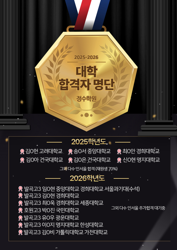 안녕하세요. 정수학원입니다. 정수 학원에서 기쁜 소식을 전해드립니다! 긴 시간 동안 성실하게 공부해 온 우리 학생들이 또 한 번 값진 결실을 맺었습니다. 2025 - 2026학년도 수시·정시 전형을 통해 다수의 학생들이 국내 주요 대학 합격이라는 의미 있는 성과를 이루어냈습니다. 학생들의 많은 노력과, 그 곁을 함께 지켜온 학부모님의 믿음이 있었기에 가능한 결과였습니다. 최선을 다해 열심히 달려와준 모든 학생 여러분들께 진심으로 축하의 박수를 보냅니다. 저희 정수학원은 학생 개개인의 학습 성향과 강·약점, 내신 성적의 흐름, 모의고사 및 수능 대비 가능성, 그리고 수시·정시 전형별 요구 요소를 종합적으로 분석한 뒤, 단순히 ‘....... <img src="https://blogthumb.pstatic.net/MjAyNjAxMTNfMjQx/MDAxNzY4MjgyNjI1MjQ5.Ysi1U_BJeVOKpItPJOmB5sCSMBwa4yb6AcsPZ_iFtmsg.q9NcVPU_lTkiEyTZsnvuqVyIiOeoVLjJEpwhotNVSx4g.PNG/image.png?type=s3" />
