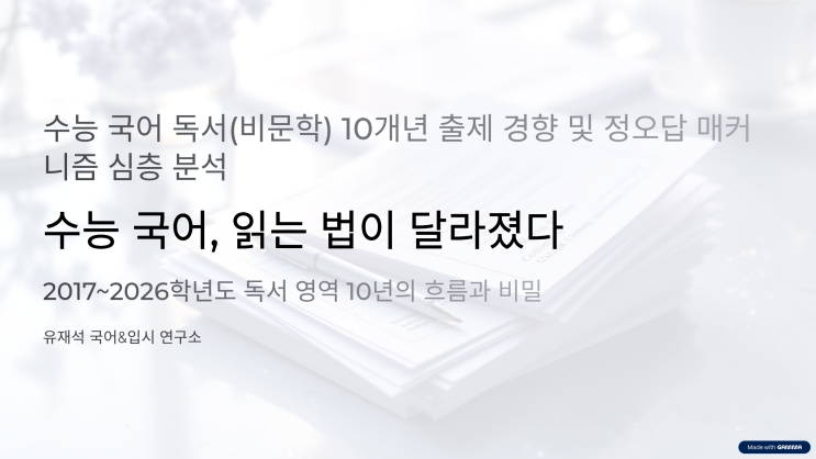 안녕하세요. 유재석 국어&입시 연구소입니다. 오늘은 국어 독서 10개년 기출분석을 통해 우리가 알아야 하는 독서의 출제원리와 이에 대한 대응 방법을 소개합니다. '정보의 홍수'에서 '논리의 정밀 타격'으로 최근 10년간(2017~2026학년도) 수능 국어 독서 영역은 **"지문의 길이(정보량)로 압도하던 시기"**에서 **"선지의 논리적 함정(정오답 판별)으로 변별하는 시기"**로 급격히 이동하였습니다. 특히 2024학년도 '킬러 문항 배제' 방침 이후, 지문의 소재는 EBS 연계를 통해 친숙해졌으나, 선지(선택지)를 구성하는 논리는 훨씬 더 치밀하고 까다로워지는 '매력적인 오답'....... <img src="https://blogthumb.pstatic.net/MjAyNjAxMjJfNzEg/MDAxNzY5MDYzODczMDMw.R5NEM72vwmBOrA3oB--yl9ibPmJh6VijjyitSg1MMNgg.J9FHRnNw9bfdOfRXp29BMqg8LeLPR-TG29B64YNv3AYg.PNG/1_10.png?type=s3" />