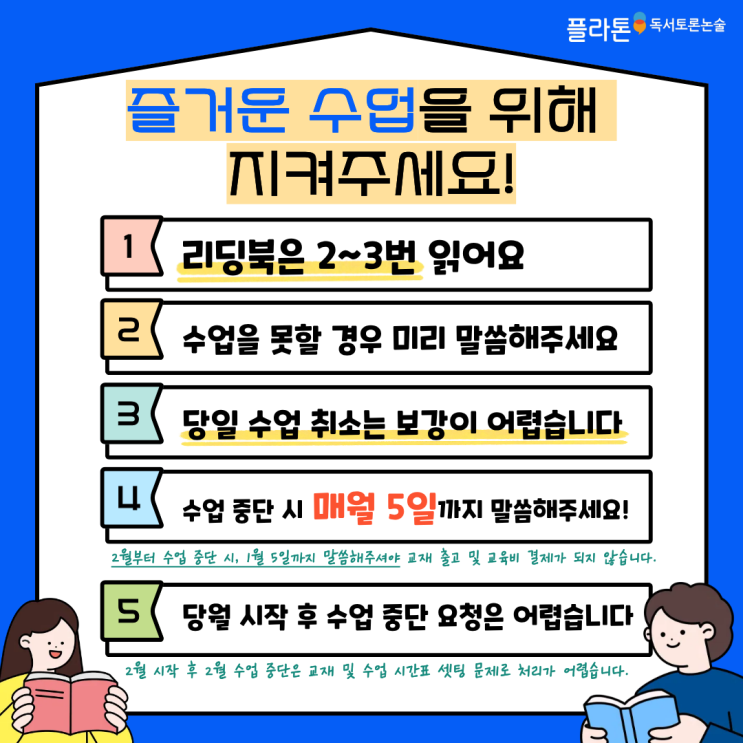 1. 리딩북은 일주일에 2-3번 읽어요. 2. 수업을 못할 경우 미리 말씀해 주세요. 3. 당일 수업 취소는 보강이 어렵습니다. 4. 수업 중단 시 한달 전 매월 5일까지 말씀해 주세요! 5. 당월 시작 후 수업 중단 요청은 어렵습니다. 구리, 남양주 지역 수업 문의 -> 031-551-1227 의정부, 양주, 동두천, 포천 지역 수업 문의 -> 031-872-0390 * 아래 링크로도 수업 상담 문의 가능하십니다~! 링크에 정보 입력 하시고 수업 상담까지 받으시면 네이버 페이 5천원을 드립니다! https://www.jrplaton.com/#go_apply #요즘학교는플라톤식 #한솔교육 #독서토론논술 #초등논술 #중등논술 #역사논술 #글쓰기 #의정부 #양주시 #구리시 #남양주 #민락동 #....... <img src="https://blogthumb.pstatic.net/MjAyNjAxMjdfMTY4/MDAxNzY5NDg5NDc0OTY2.KyLlv_NyhacOtlYRDjxQeq-5p6zCDk66Pk7SGDreGj8g.btwVARYspS8pG1WHnWame1NzYIENZKXZm7kcyqPov5Qg.PNG/%C7%C3%B6%F3%C5%E6_%C3%B9_%BC%F6%BE%F7_%BE%C8%B3%BB.png?type=s3" />