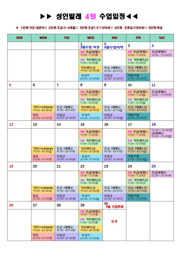 개강일 4월 2일9목) 종강일 4월 29일(수) 휴강일 4월 30일(목) : 4월 수업 종료 <img src="https://blogthumb.pstatic.net/MjAyNjAzMTlfMTQz/MDAxNzczOTAzNDYwNDA1.6KvFOxA4DT1ArN1NHw8GlxoVTmGFhWdoNwNxT11rCYcg.GprQOeA8zJWh4RcOIWHWPmQnSinLyKJ8i7QM-4AnFuMg.JPEG/%BC%BA%C0%CE_%BF%F9_%BD%C3%B0%A3%C7%A5001.jpg?type=s3" />