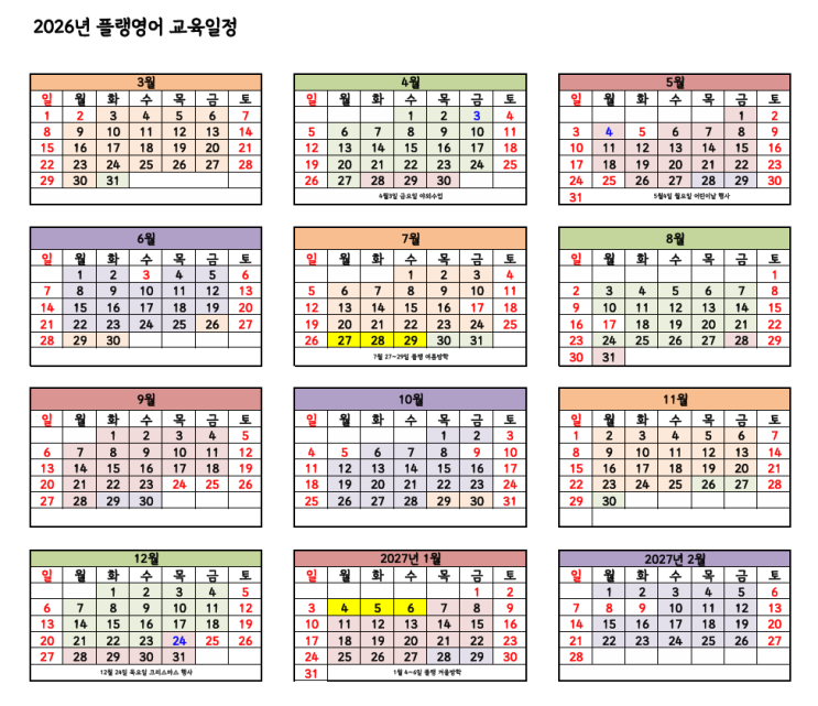 안녕하세요 플랭 영어학원입니다. 2026학년도 연간 수업 일정을 안내드립니다. 학부모님들께서 미리 학습 계획을 세우실 수 있도록 3월부터 2027년 2월까지의 플랭의 학사일정 정리했습니다. 월 20일 수업일수 기준으로 운영됩니다. 법정 공휴일은 휴강입니다. ✔ 연간 운영 원칙 플랭 영어학원은 무리한 보강이나 변동 수업 없이 안정적인 학습 리듬을 유지하는 것을 가장 중요하게 생각합니다. 월 20일 수업일수 기준 운영 법정 공휴일 휴강 여름/겨울 방학 특강 별도 안내 중간·기말고사 기간 탄력적 내신 대비 운영 수업 일수는 일정에 맞춰 균형 있게 구성되며, 공휴일로 인해 변동되는 경우에는 사전 공지 후 조정됩니다. ✔....... <img src="https://blogthumb.pstatic.net/MjAyNjAyMjZfMjcx/MDAxNzcyMDgwNTUzMDY0.sCY2z5FlYORqHpeAuEq0pE0d0sL4HYYLAvgbTboPK-wg.eIz3yqdZeGcHbnla6TpvXIgrkOlLJjLflVwGZwgriBMg.PNG/image.png?type=s3" />