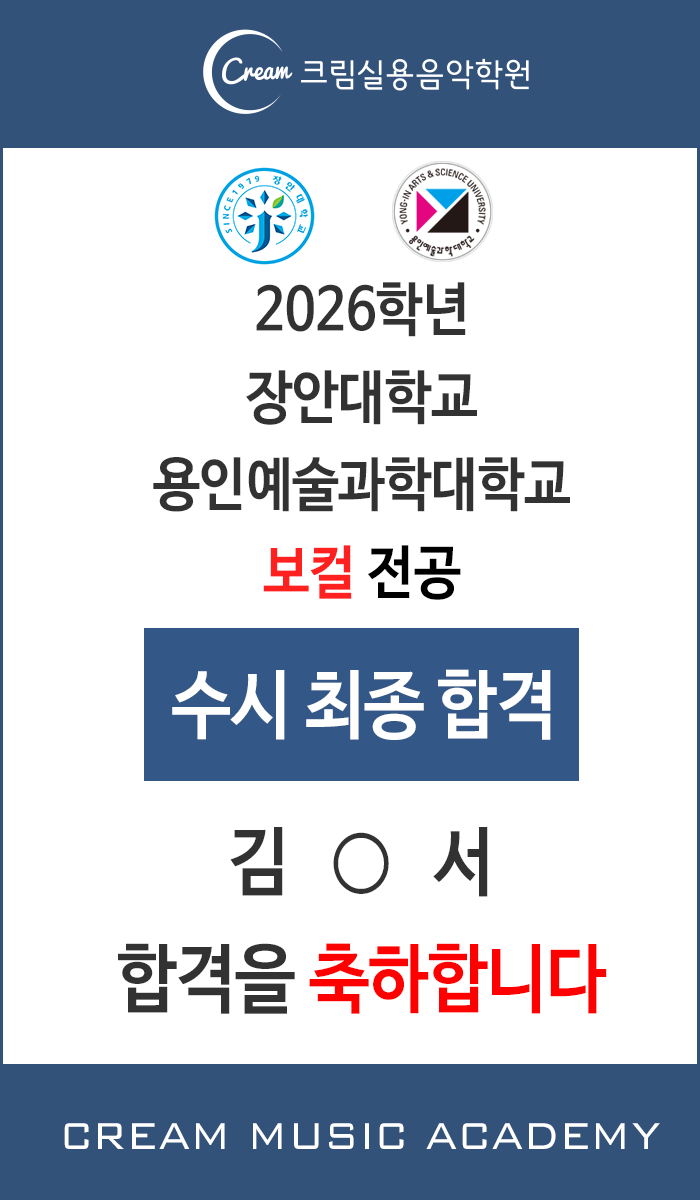안녕하세요. 크림실용음악학원 오산대역점입니다. 크림학생들의 입시 합격 소식을 전해드립니다! 2026년도 수시 장안대학교, 용인예술과학대학교 실용음악과 보컬 전공 김 ◯ 서 학생이 2개 학교 동시합격했습니다! 열심히 노력한 학생과 선생님들 모두 수고하셨습니다. 앞으로 멋진 음악생활 하시길 진심으로 바랍니다. 바른 인성을 가진 뛰어난 음악인을 길러내는 음악전문교육기관으로 더욱 더 정진해 나아가겠습니다. 감사합니다. #크림실용음악학원 #크림실용음악학원오산대역점 #크림실용음악 #오산대역보컬 #수청동보컬학원 #보컬입시 #보컬수시합격 #보컬취미 <img src="https://blogthumb.pstatic.net/MjAyNjAyMjVfOTIg/MDAxNzcyMDA2NjcxNzI3.klRKrLyOijztEnjeuKz1aBm5E8R4igglgtTBHBoJS10g.mrWGZPZn9jnCo0nWmKvhVvAMHL_PdsPrmEn4VVTwT0wg.PNG/IMG_2716.PNG?type=s3" />