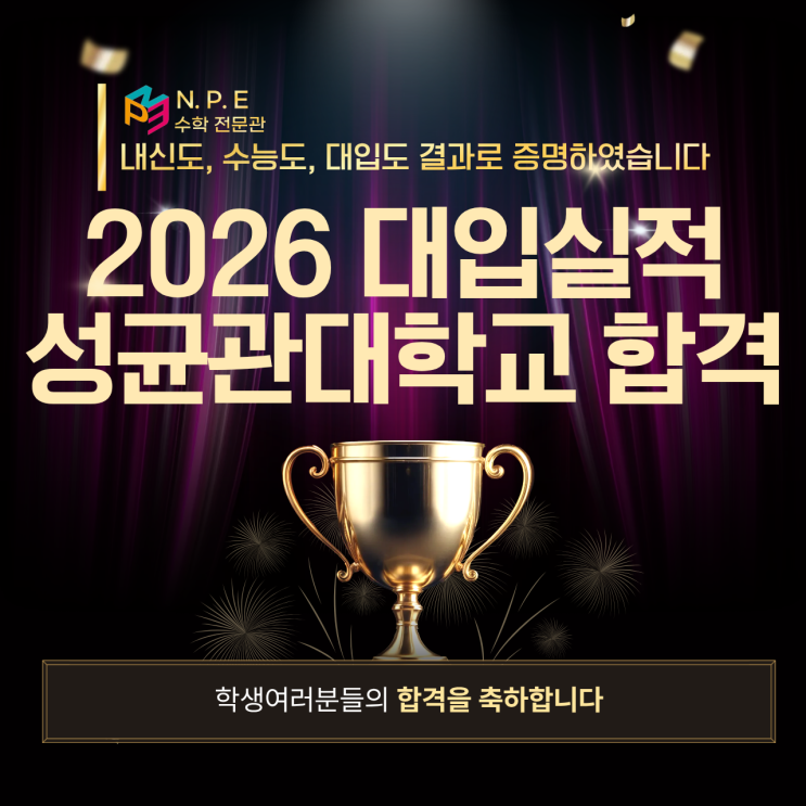 NPE 2026 대입 합격소식 9번째는 하남고 정O훈 학생입니다^^ NPE 수학학원 재원생 김건국T 고3 FINAL반 수강 무려 정시 3관왕!!! 수학내신 6등급에서 성균관대 합격까지 멋지게 대입을 성공한 학생에게는 흑역사이긴하지만 수학내신 50점대로 수학 내신 6등급으로 시작한 학생입니다^^; 타과목에비해 약했던 수학은 학습량이나 학습의 깊이가 부족한 상태에서 처음 저희학원에 오게되었고, 고등 전 기간을 본원에서 학습하며 바르게 공부하는 방법, 수학의 구조를 파악하는 방법까지 하나하나 꼼꼼하게 지도하여 모두 교정을 해주었습니다. 바쁜 고등시기에 이러한 교정을 하는것은 많은 시간을 필요로하기에 당시 매우 힘든시간이었습니다. 꼼꼼....... <img src="https://blogthumb.pstatic.net/MjAyNjAyMTBfOTAg/MDAxNzcwNjkxNDY0NjMz.HHgd0iZvs-nR5m8FY2GlmbWaF9i5qKMdhxh2xCbUflYg.yP3cE10qghcx9_YdQiWi6qb3ope9he7MlleItozJm6Yg.PNG/%C1%A6%B8%F1%C0%BB_%C0%D4%B7%C2%C7%D8%C1%D6%BC%BC%BF%E4._%281%29.png?type=s3" />
