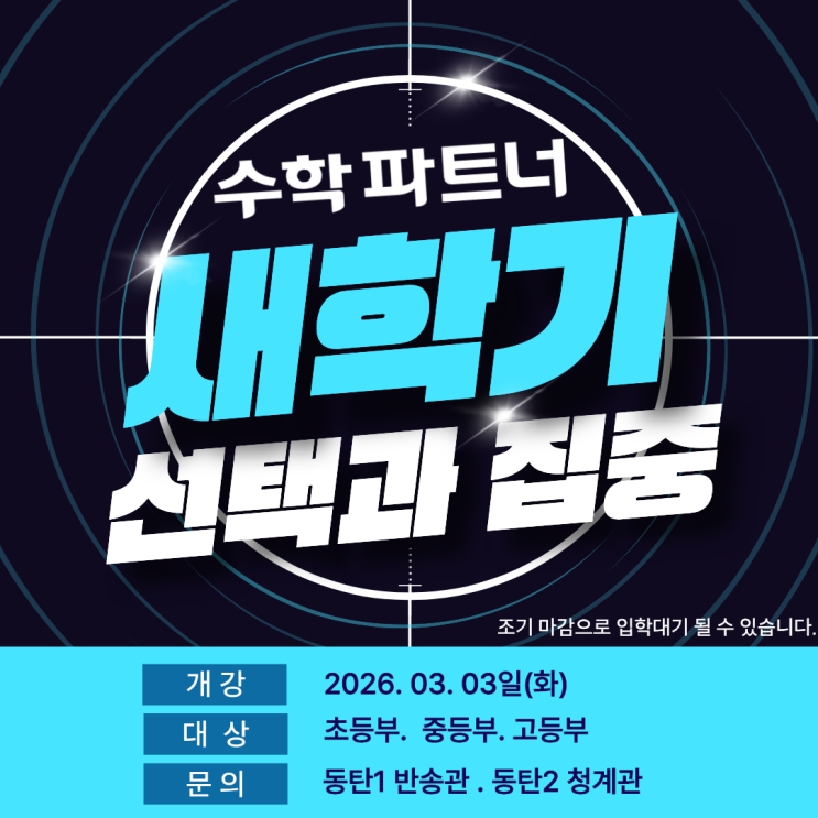 새 학기 초등· 중등·고등 수학 선택과 집중이 필요합니다! 안녕하세요. 수학파트너학원입니다. 2026년 중등부·고등부 새 학기 개강 안내드립니다. 새 학기 지금 선택과 집중이 필요합니다!! 아직도 ‘친구와 함께 다니는 학원이 우리 아이에게 맞는 학원’이라고 생각하시나요? 우리 아이의 수학 공부 상황을 알고 계시나요? * 상황이란: 일이 되어 가는 과정이나 형편을 말합니다. ✔ 개념은 아는 것 같은데 문제를 해결하지 못하는 상황! ✔ 풀이 없이 감으로 문제를 해결하려는 상황! ✔ 문제를 해결하지만 늘 시간이 부족한 상황! ✔ 늘 공부는 하는데 점수가 불안한 상황! ✔ 심화서만 고집하는 상황! 수학파트너는 학생의 상황에 맞는 수업....... <img src="https://blogthumb.pstatic.net/MjAyNjAyMTFfMjY2/MDAxNzcwNzgzMTM3MTc1.xqmXe35RxvuiEQF_0Se2NrdpPdUrj5HiTs1wSIvFKVwg.yDzz5z6OFP81E3ilC1W6EmMYtZ58uairVfzgDS3eXcYg.PNG/1.png?type=s3" />