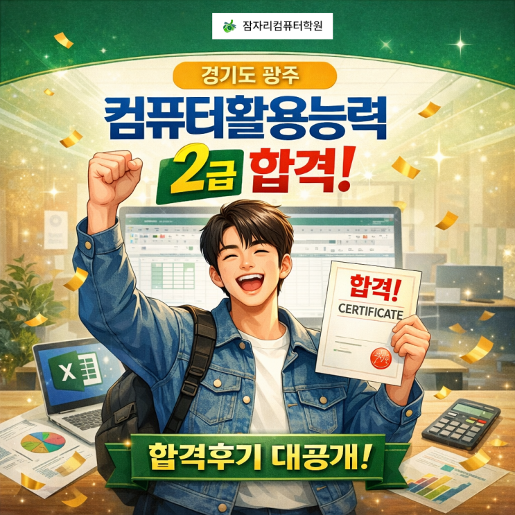 겨울은 진학, 졸업, 취업을 위해 준비하는 시간인데요 추운 겨울 컴퓨터활용능력을 공부하고 시험에 합격한 후기 소개드릴께요 컴활 자격증 합격! 안녕하세요. 경기도 광주시 경안동에 위치한 잠자리 컴퓨터학원입니다. 오늘은 저희 학원에서 컴퓨터활용능력 2급을 준비해 필기·실기 모두 합격한 대학생 성인 수강생의 실제 후기를 바탕으로, 합격 스토리를 자세하게 소개해드리려고 합니다. ▼ 잠자리 컴퓨터학원 국가 자격증, 컴퓨터 활용능력 컴퓨터활용능력 2급(이하 컴활 2급)은 ✔ 대학생 취업 준비 ✔ 공기업·사기업 서류 전형 ✔ 사무직 실무 역량 증명 을 위해 많은 분들이 도전하는 대표적인 국가공인 자격증입니다. 하지만 독학으로 준....... <img src="https://blogthumb.pstatic.net/MjAyNjAxMDJfMjIg/MDAxNzY3MzQ0ODM3MDU2.0Qblho9ndhR5b_v8PXMEdMHBiZiY-ns293IafQZ82Ywg.sAuwCtiB3qbqqlHPk3Pq5xOjg5yDc3i_zJtUMRw19RAg.PNG/2026-01-02_00.png?type=s3" />