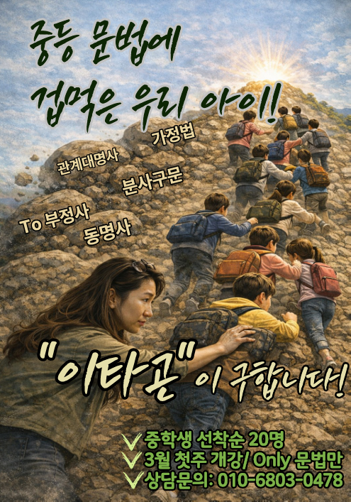 " 문법이 이제 제일 자신 있는 과목이 될거에요! " 중등 문법에 겁먹은 우리 아이, 이타곤은 ‘함께’ 오릅니다. 중등문법은 아이들보다 부모가 더 먼저 긴장하는 구간입니다. 문법이 시작되는 순간 ✔️ 아이는 갑자기 말수가 줄고 ✔️ 영어가 재미없어지고 ✔️ “외우기만 하는 과목”이 되어버리죠. 그 이유는 단 하나입니다. 문법을 ‘혼자’ 오르게 만들었기 때문입니다. 중등 문법은 ‘산’입니다 하지만 길 안내자가 있으면 다릅니다. 이타곤 중등 문법반은 문법을 지식전달-> 문제풀이-> 채점 구조가 아니라 스토리 ‘구조’로 가르칩니다. 시제 주동일치 접속사 to부정사 동명사 관계대명사 가정법등.. 이 모든 문....... <img src="https://blogthumb.pstatic.net/MjAyNjAxMDNfMjAz/MDAxNzY3Mzk5OTYzOTQ0.p6-LDOrotTtSuMZ_ThyVif_bKmS3ZgpOOCRlTLEofhEg.-QpZ2T98cKlS9IKpmMbMWhh4VucRL_pjvFFRBOiG0n8g.PNG/1767398384708.png?type=s3" />