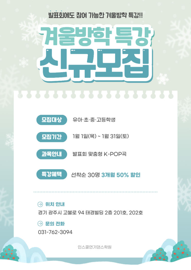 안녕하세요~ 경기광주 태전동 댄스학원 인스쿨연기댄스학원입니다!! 날씨가 아직 많이 추운데요, 다들 잘 지내고 계신가요? 인스쿨은 26년에도 열심히 굴러갑니다 오늘은 방학을 맞이한 우리 친구들을 벌떡!! 일어나게 할 소식을 들고왔어요 [❄️겨울방학 특강 안내❄️] [모집 대상] 유아/초등/중등/고등학생 (초보자들도 환영해요!!) [모집 기간] 1월 1일~1월 31일 한달간! [과목 안내] 발표회 맞춤형 인기 K-POP 댄스곡 [특강 혜택] 선착순 30명 3개월 등록 시 50% 할인! [수업 정보] 수업 시간 : 쉬는시간 10분 포함 총 90분 수업 날짜 : 요일마다 상이 (시간표 참고) 수업 내용 : 발표회 맞춤 무대 형식 K-POP 안무 기본기 및....... <img src="https://blogthumb.pstatic.net/MjAyNjAxMDdfOTEg/MDAxNzY3NzUyNzU3Njk3.EAqFc5A4HD_PXsDeA7VURiqFw538ESZjpTVVitZ06Fwg.O8vmMnC9ARWKxe25Ehhd0xclwLNFYmZzI_bwwDABL-Yg.PNG/%B0%DC%BF%EF%B9%E6%C7%D0%C6%AF%B0%AD_%282%29.png?type=s3" />