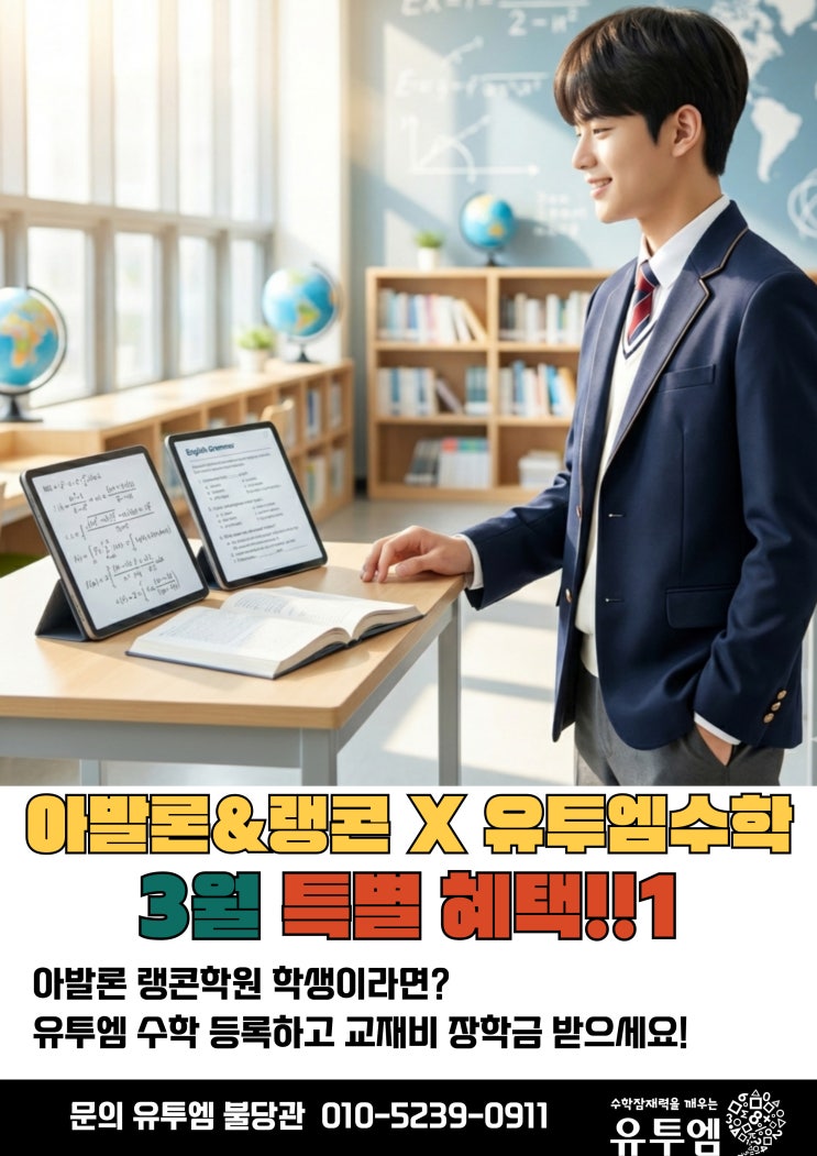 영어가 강한 아발론 학생이 수학까지 앞서나갈 수 있도록! 유투엠 수학이 아발론/랭콘 학생들을 위한 **'봄학기 학습 지원 프로젝트'**를 시작합니다. 아발론 & 랭콘 전용 혜택 중등부: 4만원 교재 장학 지원 초등부: 3만원 교재 장학 지원 원스톱 학습 매니지먼트 아발론과 유투엠의 협업으로 셔틀 노선과 수업 시간표를 공동화해 학생들의 학습 효율을 완성합니다. 이제 학원 시간표 및 셔틀에 대한 이중 시간 낭비 없이, 영·수 전문 관리를 동시에 받으실 수 있습니다. 입시 전문 학원들의 노하우가 집약된 통합 케어로 우리 아이의 잠재력을 깨워주세요. <img src="https://blogthumb.pstatic.net/MjAyNjAyMjVfNjkg/MDAxNzcxOTk1NzIyNDg4.vE47mitKOO89i5yJnPonnXRslOvPGD8z_gU3uOIDIO8g.I_LJxanmExnrTr5dDj_QGN31xUBs30MMkZWtQhg7km8g.JPEG/%C1%A6%B8%F1%C0%BB-%C0%D4%B7%C2%C7%D8%C1%D6%BC%BC%BF%E4_-001_%2873%29.jpg?type=s3" />