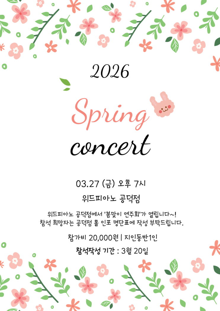 안녕하세요~ 여러분 그동안 잘 지내셨나요~? 제가 다시 돌아왔습니다~~ ㅎㅎ 저희 위드피아노 공덕점에서는 2~3월에 한 번씩 연주회를 개최합니다 올해도 어김없이 돌아온 연주회~! 2026년 첫 연주회에 여러분을 초대합니다~♡ 이번 겨울은 춥다가 따뜻하다가 아주 왔다갔다였잖아요ㅠㅠ 저는 빨리 봄이 돼서 벚꽃을 보러 가고 싶더라구요~? 매니저랑 함께할 파티원 구함..ㅎ 자 이제 말을 줄여보고,, 쨘ㅎㅎㅎ 저희 연주회에 초대합니다~ㅎㅎ 사실 공덕점 수강생 한정이긴해요..ㅎ ㅎㅎ 그 말은 즉, 수강생이 되시면 연주회에 참가할 수 있다는 ㅎㅎㅎ..ㅎ 말입니다~!! 연주회에 오셔서 수강생분들이 열심히 연습하신 곡도 들으시구, 맛있는 음....... <img src="https://blogthumb.pstatic.net/MjAyNjAyMjRfMjU3/MDAxNzcxOTE1OTQ1MzE3.jVw48Xwyg-dqvadN-CVgyLkS4wR0DewZHqhYA_rZ4y8g.KjXjYdv7ThexriG9OJ7mTTKQEytt1_T0TrbafsNw8V0g.PNG/KakaoTalk_20260224_135635245.png?type=s3" />