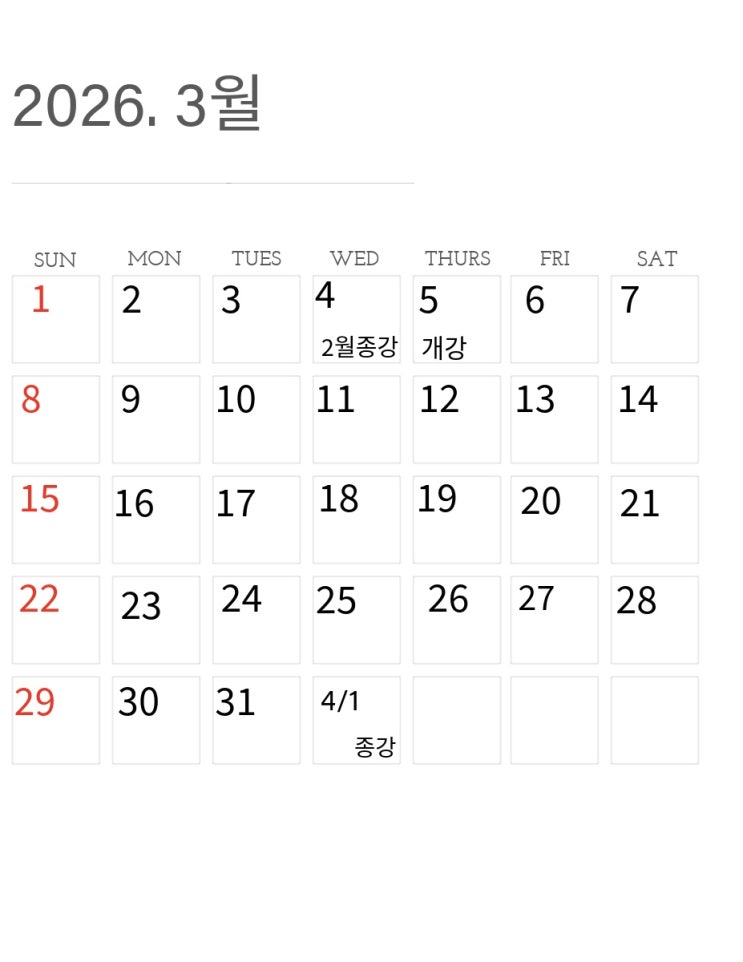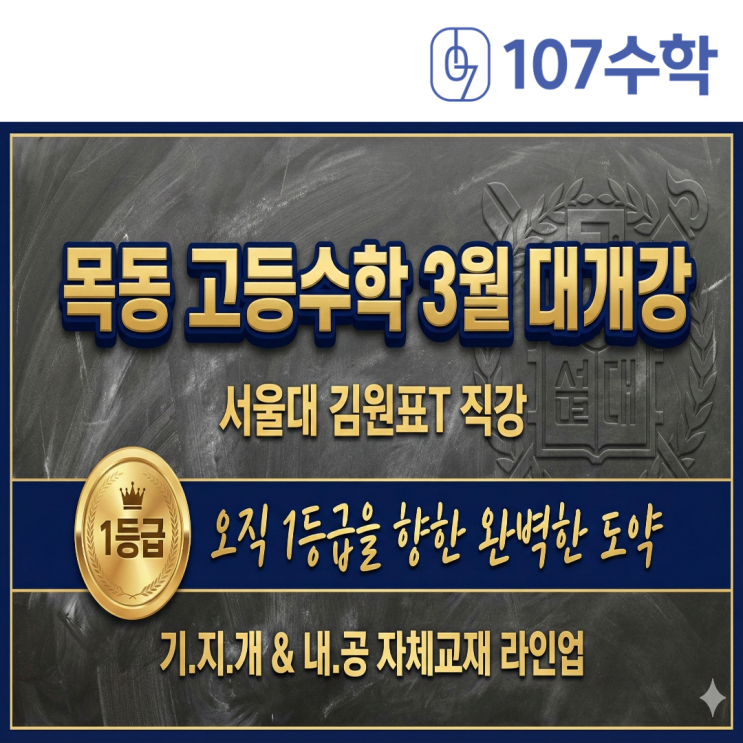 새 학기의 시작, 완벽한 도약을 위한 3월 개강 안내 안녕하세요, 목동107수학입니다. 지난 1, 2월 겨울방학 동안 진명여자고등학교, 양정고등학교, 목동고등학교, 대일고등학교 등 목동 주요 고등학교의 7개년 기출 분석 포스팅을 꾸준히 연재해 왔습니다. 학교별 출제 경향과 난이도 흐름을 정밀하게 분석하며 실질적인 내신 대비 전략을 공유해드렸는데요. 오늘은 잠시 기출 분석을 멈추고, 목동 고등수학 성실의 아이콘, 서울대 김원표 선생님의 3월 개강 시간표를 안내드립니다. 본격적인 학기가 시작되고 새로운 2학년 생활에 적응할 즈음, 4월 중순이 되면 학생들은 국어·영어는 물론 각종 암기 과목 내신 준비에 본격적으로 집....... <img src="https://blogthumb.pstatic.net/MjAyNjAyMjNfMjY1/MDAxNzcxODQzOTk1MjQ4.sWPGSJMRWIFhm6aB_haDk1XjWtCj8zil0v2LvpFbj6Mg.LgQIONlhKyezhCcKmom0Tlc_w_4J-rASiazN0cCZMVog.PNG/%C1%A6%B8%F1%C0%BB_%C0%D4%B7%C2%C7%D8%C1%D6%BC%BC%BF%E4._%2852%29.png?type=s3" />