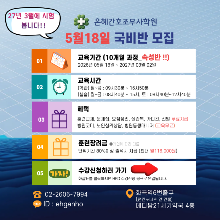 안녕하세요~ 서울 강서 은혜간호학원입니다*^^* 붉은말의 기운처럼 힘차게 질주해 보아요~! 2026년에도 저희 은혜간호학원은 간호조무사를 향해 1년동안 함께 달려가실 반짝반짝 빛나는 수강생 분들을 모집합니다! * 간호조무사 국가 자격증 시험은 매 년마다 2회 시행되고 있습니다. (3월/9월) * 간호·간병통합서비스제도 시행 이후 간호조무사 인력 수요가 늘어 취업성공률 UP! 한의원, 요양병원, 중소 및 대형병원부터 건강검진센터, 보건소, 어린이집 등 다양한 기관에 취업 가능합니다! * 국비반, 일반반(주간/야간) 모두 모집중입니다! (2027년 상반기 3월초 시험대비반입니다.) * ----------------- * 국비반/일반반>> 국민취업지원....... <img src="https://blogthumb.pstatic.net/MjAyNjAyMjNfMjgy/MDAxNzcxODI1MjE0MDQx.hdam_EhDFlo8riALjkw667GdgHhza9XSdTJ2P2jidx4g.cNY_tAX3H__LWBgubF9Vd0bHqlcXRFLKo-jPL804dDQg.PNG/26%B3%E2_5%BF%F9%B9%DD%28%B1%B9%BA%F1%29_%C6%CB%BE%F7.png?type=s3" />