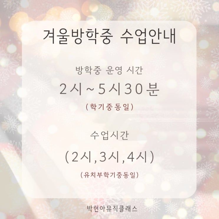 안녕하세요^^ 겨울 방학중 수업시간 안내 드립니다~ 겨울방학은 아이가 잠시 숨을 고르며 자신의 속도로 배움을 이어갈 수 있는 소중한 시간입니다. 피아노는 서두르지 않고 꾸준히 이어갈 때 조금씩 실력이 쌓이고, 음악을 즐기는 마음도 함께 자랍니다. 특히 겨울방학은 그동안 부족했던 부분을 차분히 돌아보고 기초를 다시 한 번 단단히 다질 수 있는 시기입니다. 이번 겨울, 아이의 일상 속에 음악이 자연스럽게 스며들 수 있도록 따뜻한 피아노 시간으로 함께해 주세요 신입생모집 예비초 1학년 유치부 ✔️ 정원제 수업 (정원마감시 대기있을 수 있어요) #경북도청피아노학원 #경북도청피아노 #예천피아노 #안동피아노 #경북....... <img src="https://blogthumb.pstatic.net/MjAyNTEyMjZfNjAg/MDAxNzY2NjgwNjgzMDk5.vuOVdFdPj-gmloq__9keFQW9cgFeFnFW8hkIg2YeQ64g.wWcu1XjwnyClnKhERKMiSpoEmUVufzY6Oj79EqaiuTcg.JPEG/900%A3%DF%B3%EB%B6%F5%BB%F6_%C3%CA%B7%CF%BB%F6_%B1%CD%BF%A9%BF%EE_%C0%AF%C4%A1%BF%F8_%BE%EE%B8%B0%C0%CC%C1%FD_%BE%CB%B8%B2%C0%E5_%C0%CE%BD%BA%C5%B8%B1%D7%B7%A5_%B0%D4%BD%C3%B9%B0%A3%DF20251226%A3%DF012143%A3%DF0000.jpg?type=s3" />