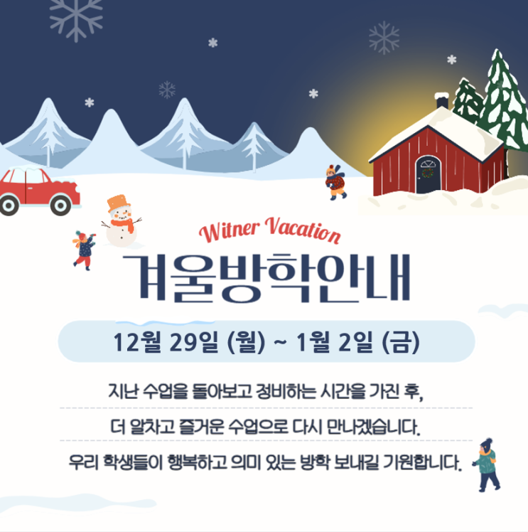 학원 겨울방학 안내드립니다 겨울방학 기간은 12월 29일 월요일부터 1월 2일 금요일까지이며 해당 기간 동안 모든 수업은 쉽니다 잠시 쉬는 동안 선생님들과 학생들 모두 재충전의 시간을 갖고 겨울방학에는 더 집중도 높은 수업이 될 수 있도록 준비하겠습니다 개강일은 1월 5일 월요일입니다 방학 이후 더 좋은 모습으로 만나 뵙겠습니다 감사합니다 <img src="https://blogthumb.pstatic.net/MjAyNTEyMjlfMTkw/MDAxNzY2OTgxNDEwNDgw.R5Og5ke8pAWP1A23yt2QlzphvrFSX-w4YL0tPrrHUX4g.nizAIBr9q_wMGekBbbDplmt9ulGjwNhjMheGpP4eKHsg.PNG/1766033583048.png?type=s3" />
