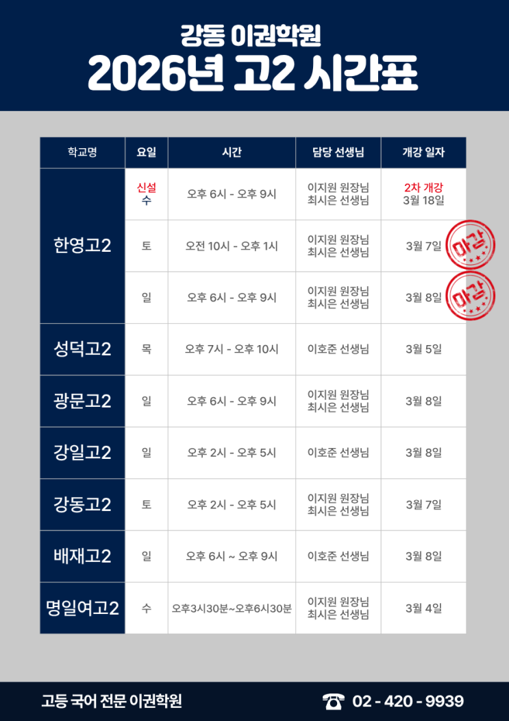 '최고의 컨텐츠와 고밀도 관리로 이끌어가는' 둔촌고 3월 정규반 개강안내(둔촌고 영어학원 영어내신)