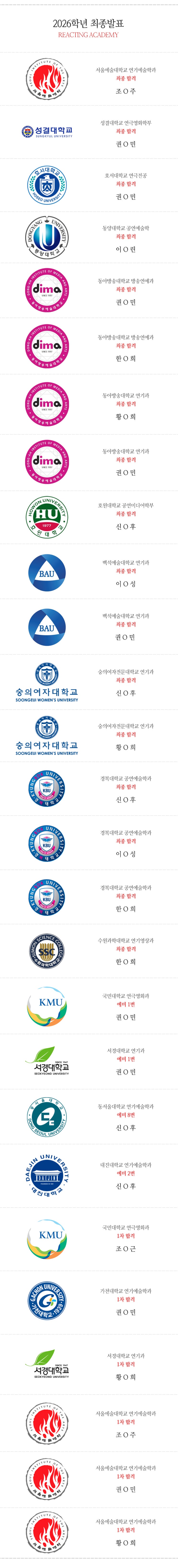 REACTING ACADEMY '9기' 최종결과!! 총 7명 중, 27학교 합격! 최종합격 17명 1차&예비합격 10명 <img src="https://blogthumb.pstatic.net/MjAyNjAzMDFfNjQg/MDAxNzcyMzY4NDg0Njgx.ITiQm9lwjOVFqdRFx9J13ZOIfivYMCLCP-SL2ZDKCygg.LbrPzXsTRIakSqKNGE7cEUyerzlIoOr2SGjDTzv-h_Ig.JPEG/2026%C3%D6%C1%BE.jpg?type=s3" />