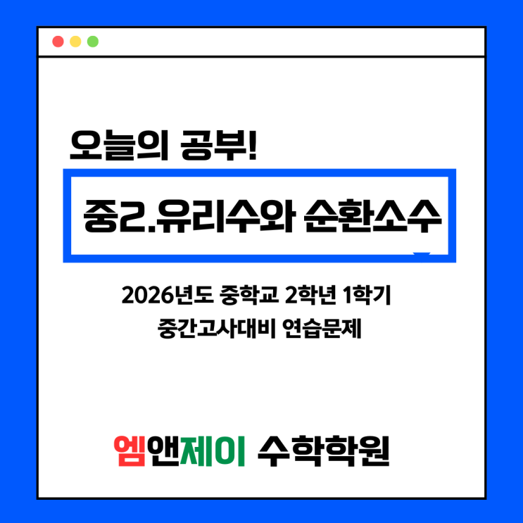 2학년 친구들~새학년 새학기는 잘 적응하고 있나요?^^ 2학년 1학기 첫 중간고사를 위해 수학공부는 조금씩 꾸준하게 하길 바랍니다~!!! 오늘은 1단원 유리수와 순환소수에서 문제를 픽!해보았는데요. 1학년때 배웠던 정수에서 유리수까지 수체계를 확장해 가는 단원입니다. 연산연습은 필수 이지만 유리수의 정의가 뭔지 유리수에는 어떤 수들로 구성되어있는지 꼭 개념은 기억하길 바랍니다~!! 1번 문항은 자주 출제되니 한번 살펴볼까요? 10의 거듭제곱을 이용하여 분수의 합으로 표현된 부분 보이죠? 소수로 표현해서 더해보면 소수점 아래 숫자가 끝없이 나오지만, 똑같은 숫자 1이 반복됨을 알 수있죠~ 그래서 순환소수로 표현 후에 분수로....... <img src="https://blogthumb.pstatic.net/MjAyNjAzMTdfMzIg/MDAxNzczNzMwNDEzMzg4.I2NnCoWDXTUkwyg9C5KU6z8WRv7lZlA9CelVz5ugCIMg.jwi8nzfmCZRR4UqORCZBzclq91EUIsJzPKRfF8ywnOgg.PNG/%BA%ED%B7%E7_%C8%AD%C0%CC%C6%AE_%BA%ED%B7%A2_%BD%C9%C7%C3_%C4%AB%B5%E5%B4%BA%BD%BA_%C5%D8%BD%BA%C6%AE_%C1%A4%BA%B8%BC%BA_%C0%CE%BD%BA%C5%B8%B1%D7%B7%A5_%C6%F7%BD%BA%C6%AE_%285%29.png?type=s3" />
