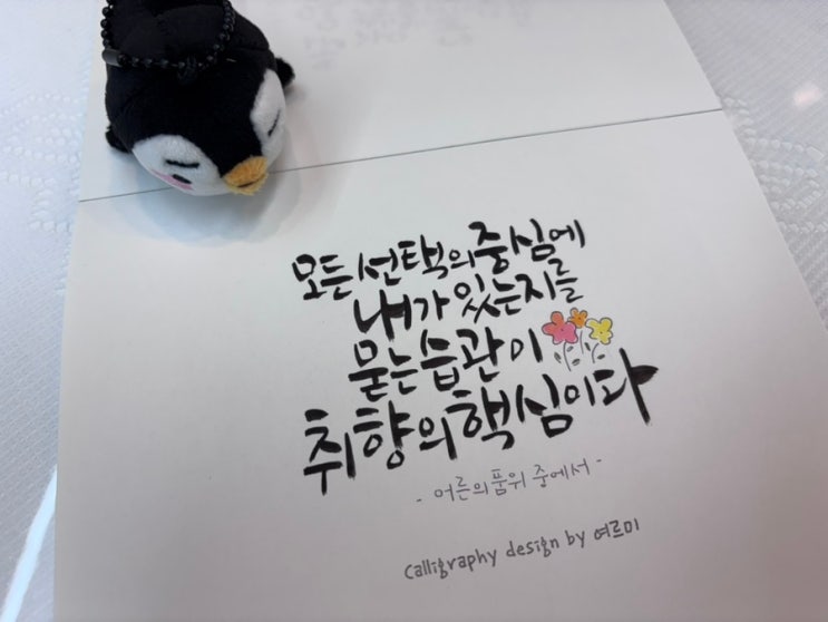 사소한 물건 하나, 자주 가는 공간, 좋아하는 습관으로 자기 세계를 드러내는 사람. 남들과 비교하기 어려운 분위기를 가진 사람에게서 나는 조용한 힘을 느낀다. 넘칠 정도로 많이 가지지 않았기에 더 대단하다. #책속문장필사하기 #어른의품위#최서영 #calli.yeoreumi#여르미캘리그라피 #캘리여르미#여르미캘리#누누슴0125 #붓펜캘리#붓캘리#아트펜캘리#인물드로잉 #감성글귀#손글씨#붓글씨 #강동구둔촌동#송파구#포레온올림픽파크 #올림픽공원 #캘리수업중#수강생모집 #수강생모집중 <img src="https://blogthumb.pstatic.net/MjAyNjAxMTBfMjUw/MDAxNzY4MDQ3MzU4ODE3.SSrfSMfLis_xvheLmD1AU_fWm9aX0LaDa7IS-TyduS4g.BD7ZqfLy46j3ovxlrEmVVTbj3z1Sng1QxZJv6Tq_k7Ag.JPEG/IMG%A3%DF1224.jpg?type=s3" />