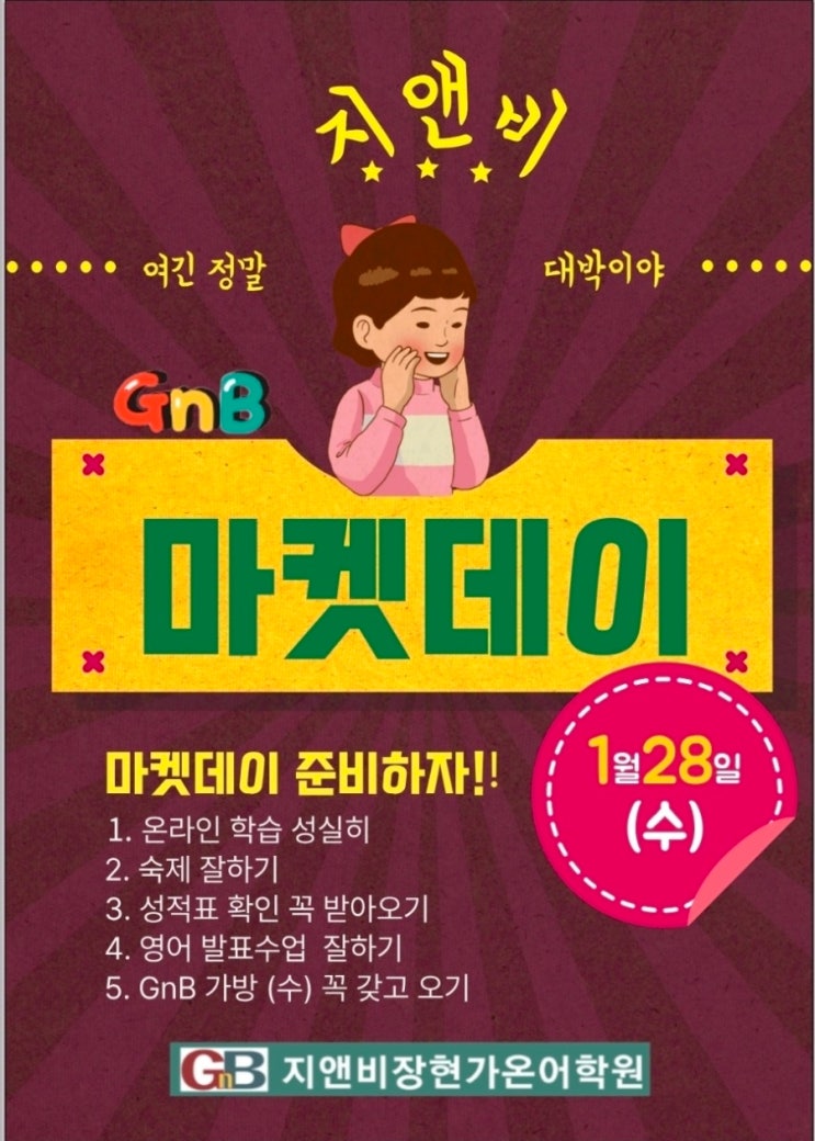 영어가 즐거워지는 곳, 장곡동 영어학원, 시흥가온초 근처 영어학원인 GnB장현가온어학원입니다. 오는 1월 28일(수), 우리 아이들이 손꼽아 기다려온 마켓데이(Market Day) 행사를 진행합니다. 이번 행사는 장곡동 영어학원의 가온초 & 한여울초 학생들이 한 학기 동안 성실함과 열정으로 쌓아온 '포인트 달러'를 경제 활동에 사용해 보는 소중한 기회입니다. 왜 GnB장현가온의 이벤트는 유별날까요? 동기부여: 스스로 노력해 얻은 포인트로 원하는 물건을 성취하는 기쁨을 배웁니다. 실전 영어: 모든 거래는 오직 영어로만! 교과서 밖 진짜 영어를 내 것으로 만듭니다. 성취감: 한 학기 동안의 성실함을 보상받으며 영어 학습에 대....... <img src="https://blogthumb.pstatic.net/MjAyNjAxMjdfMjgx/MDAxNzY5NDQ1MTgyMDkz.5gCuFNHFO9OlQtIKTAXbTe1VZLPk-QF1-fKucXE1_Twg.cSopyK9eLcS3jyV1XCC4tIPbuGpxeBvu0buKJAbPupcg.JPEG/900%A3%DFBandPhoto%A3%DF2026%A3%DF01%A3%DF14%A3%DF21%A3%DF17%A3%DF06.jpg?type=s3" />