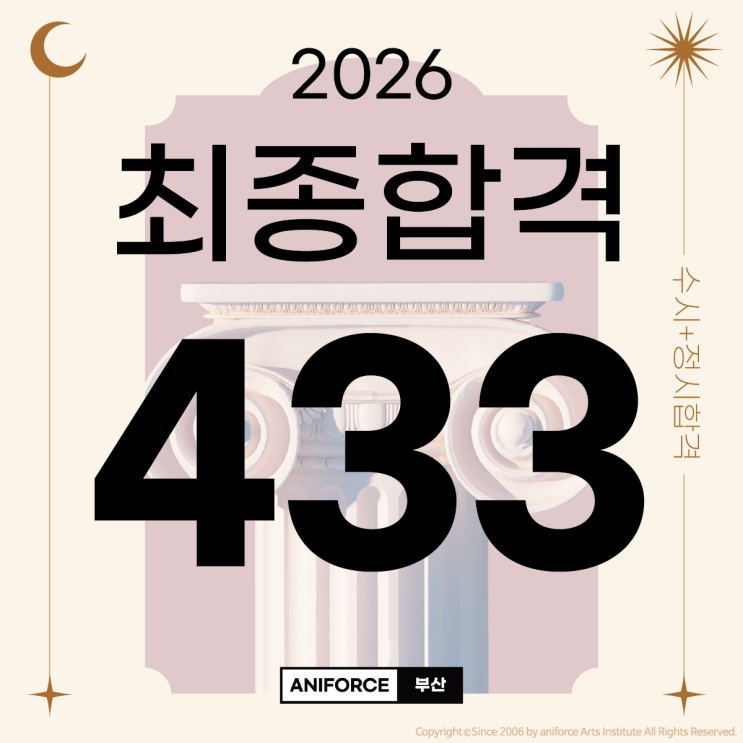 부산대표미술학원 2026년 부산 애니포스, 역대급 단독 합격 부산 애니포스는 총 433명의 단독 합격자를 배출하며 역대 최고의 입시 성과를 이루어냈습니다. 이는 부산 지역의 디자인, 순수미술, 조소, 만화 등 모든 입시미술학원을 통틀어 가장 많은 합격자 수라는 의미 있는 기록입니다. 특히 만화,애니메이션 입시는 일반적인 디자인 입시와 달리 디자인,공예,회화 등 여러 전공을 동시에 준비하는 구조가 아닙니다. 오직 <만화 애니메이션>단일 전공만으로 433명의 합격자를 배출 433명 단독 합격은 서울이 아닌, 지역 부산내에서 체계적인 커리큘럼과 전문적인 지도, 그리고 학생들의 노력으로 만들어낸 기적에 가까운 결과입니다. 433....... <img src="https://blogthumb.pstatic.net/MjAyNjAyMjNfMjE3/MDAxNzcxODI4MTA5OTE5.eoJCQgPvYChQPHlhWhBvz6biip1-L6N15nurQp97ZhMg.WPmmt2SoOBYKQ2fhOoVDjgGxulYrz-pb63Cb1hS71h8g.PNG/2026_%C3%D6%C1%BE%C7%D5%B0%DD_%BD%E6%B3%D7%C0%CF_%281%29.png?type=s3" />