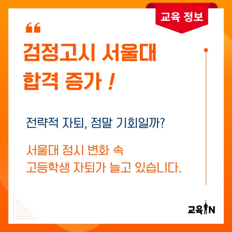 검정고시 서울대 합격 증가, 서울대 정시에서 전략적 자퇴 선택 늘어나는 이유 고등학생 자퇴 확산과 검정고시 정시 지원 증가… 입시 구조 변화가 만든 새로운 흐름 최근 입시 현장에서 심상치 않은 변화가 감지됩니다. 서울 상위권 대학을 목표로 하는 학생들 사이에서 ‘학교를 떠나는 선택’이 더 이상 예외가 아니라는 점입니다. 특히 검정고시 서울대 합격 사례가 눈에 띄게 늘면서, 학부모들 사이에서도 고민이 깊어지고 있습니다. 과거에는 극히 일부의 선택지로 여겨졌던 전략적 자퇴가 이제는 하나의 입시 경로로 인식되고 있습니다. 이는 단순한 유행이 아니라, 구조 변화에서 비롯된 현상입니다. 1️⃣ 서울대 정시에서 나타나는 변....... <img src="https://blogthumb.pstatic.net/MjAyNjAyMjFfMjY2/MDAxNzcxNjYzNDUzMjc3.WQSYDu-0nvBsSdQIy3NOmwFVAKD281tRq3jGGTSRJv4g.r2FdV-K2tBzz-M2f6W5cwo_vmegdOYvvFb4iJ92IS_Ug.JPEG/001.jpg?type=s3" />