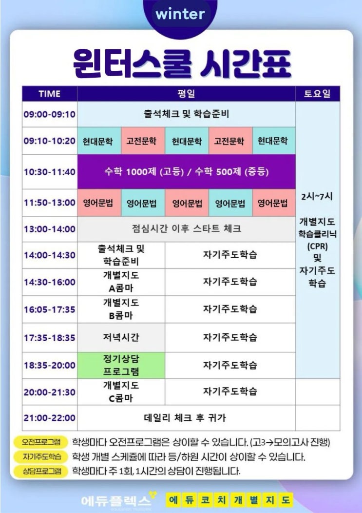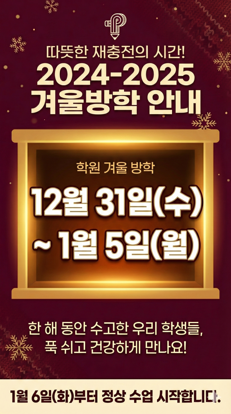 안녕하세요. 매일 매일이 점점 더 추워지고 있는 요즘입니다. 특히 독감이 많이 유행하고 있기 때문에 원활한 방학 학습을 위해 건강관리에 최선을 다해야 할 듯 합니다. 오늘은 저번 윈터스쿨 공지에 이어서 내용을 조금 더 추가해보도록 하겠습니다. 이번 윈터스쿨은 1월 5일 월요일부터 2월 26일 목요일까지 운영 예정입니다. 2월에 있는 개학기간에는 윈터스쿨을 운영하지 않고 평소대로 2시 ~ 11시까지 운영합니다. 봄방학을 하게 되면 다시 아침 9시 ~ 밤 10시까지 운영시간이 변경되어 윈터스쿨을 진행합니다. 또한 설 연휴에는 휴무입니다. 이번 윈터스쿨 시간표 입니다. 오전은 국/영/수 프로그램으로 진행될 예정이며 문해력 이슈를 해....... <img src="https://blogthumb.pstatic.net/MjAyNTEyMjlfMTEx/MDAxNzY2OTg5MzUwNzk4.9tHrIbIidIwUzevSfGD1P9NCoZC0Z2hqxEw5NlCHYMkg.2MSbmp2kmEp0PIMs4IO0pIIyPQVYkVH4PDwrkfzoupcg.JPEG/IMG%A3%DF3027.JPG?type=s3" />