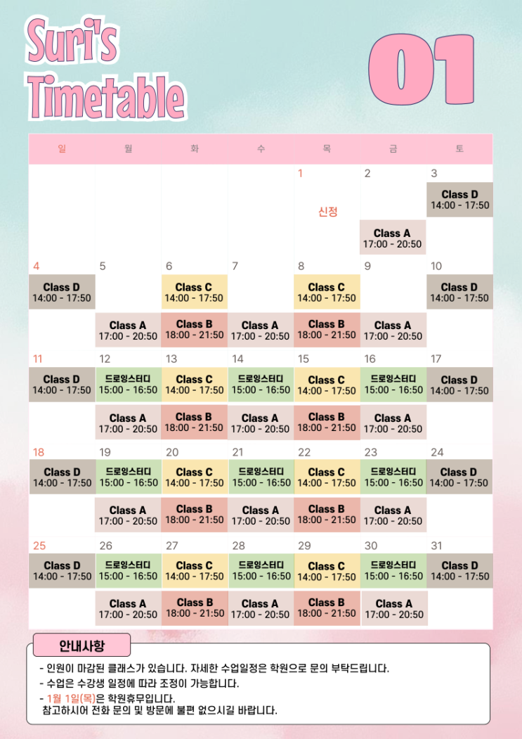 구서지점 1월 시간표 및 신규반 개강 안내