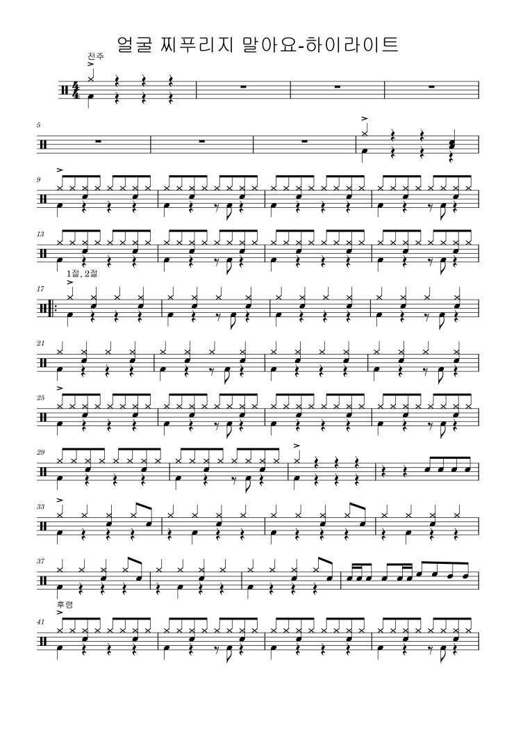 *연습하면 큰 어려움 없이 치실수 있도록 취미 드러머분께 맞춰 쉽게 편곡된 악보입니다. 원곡과 똑같은 악보를 원하시는 분은 악보사이트를 참조하세요. #쉬운드럼 #쉬운드럼악보 #하이라이트_드럼 #얼굴_찌푸리지_말아요 #얼굴_찌푸리지_말아요_드럼 <img src="https://blogthumb.pstatic.net/MjAyNjAxMDZfMjgx/MDAxNzY3NjY3MzI0MDMz.66JBlRmbk8laMYZbbnDywa2MGz2Y2qZD3pMHiSKluIkg.v81OcU-5TMUoGjC3zU8t8Yz2wfTcy1vwZeEUax3JJRsg.PNG/%BE%F3%B1%BC_%C2%EE%C7%AA%B8%AE%C1%F6_%B8%BB%BE%C6%BF%E4-%C7%CF%C0%CC%B6%F3%C0%CC%C6%AE-1.png?type=s3" />