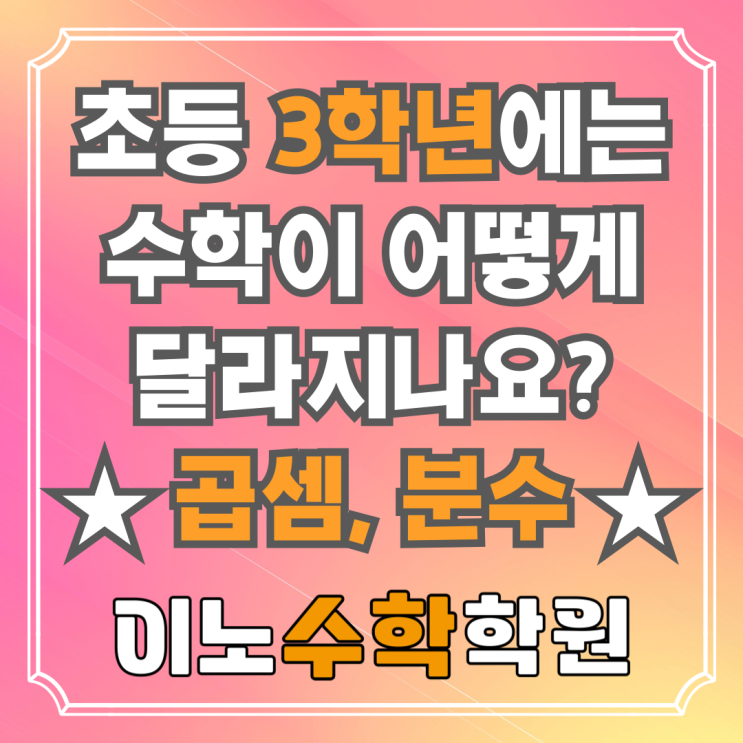 초등 3학년 수학의 운명을 결정하는 시기 곱셈과 분수의 시작 안녕하세요, 여러분! 오늘은 초등학교 3학년 학부모님들이라면 꼭 알아야 할 중요한 이야기를 나눠보려고 합니다. 바로 곱셈과 분수에 관한 이야기입니다. 왜 3학년이 이렇게 중요한가요? 많은 교육전문가들이 입을 모아 말합니다. "초등학교 3학년은 수학의 분기점이다."라고요. 실제로 3학년은 단순한 덧셈과 뺄셈을 넘어서 본격적인 수학적 사고가 시작되는 시기입니다. 저학년 때는 구체적인 사물을 세고 더하는 활동이 주를 이뤘다면, 고학년으로 올라갈수록 추상적 개념을 이해하고 활용하는 능력이 필요해집니다. 그 시작점에 곱셈과 분수가 자리하고 있죠. 많은 학....... <img src="https://blogthumb.pstatic.net/MjAyNjAxMDhfMjk1/MDAxNzY3ODAyNTcxNjM2.zBfPFnbjPQvZGgeMswFu2v6QMu4opeYsiOrc2VMZ5LIg.Eorm7CIol1RaJUAgE21Ck5wjcj4Nu4wRkBlju4iJBh8g.PNG/001.png?type=s3" />