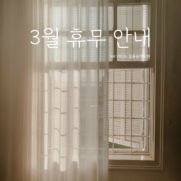 안녕하세요! 음악을 사랑하는 여러분의 든든한 조력자, HM 실용음악학원입니다 어느덧 코끝을 스치는 바람이 제법 부드러워졌네요. 차가운 겨울의 끝자락을 지나, 만물이 소생하고 새로운 시작의 에너지가 샘솟는 희망찬 3월이 우리 곁으로 성큼 다가왔습니다. 3월은 새 학기, 새 시즌이 시작되는 시기인 만큼 많은 분이 새로운 목표를 세우고 연습실을 찾아주시는 열기가 대단한데요! 열심히 달려오고 계신 우리 수강생분들이 연휴 기간에도 흐름이 끊기지 않고 연습에 매진할 수 있도록, 3월 공휴일 운영 일정에 대해 상세히 안내해 드립니다:) 3월 운영 일정 핵심 요약 이번 2026년 3월 1일 삼일절은 일요일입니다. 저희 학원의 고정....... <img src="https://blogthumb.pstatic.net/MjAyNjAyMjRfMTUw/MDAxNzcxOTE4MDYwNjc1.gQtaVvie3CKXBx8oKMPTKl19uX_R9Zafl8V-j3MCHUgg._qBWZJfn6w3GbmZwXO1WLRHyNdQtV8LfrXTa7tfOObog.PNG/006.png?type=s3" />