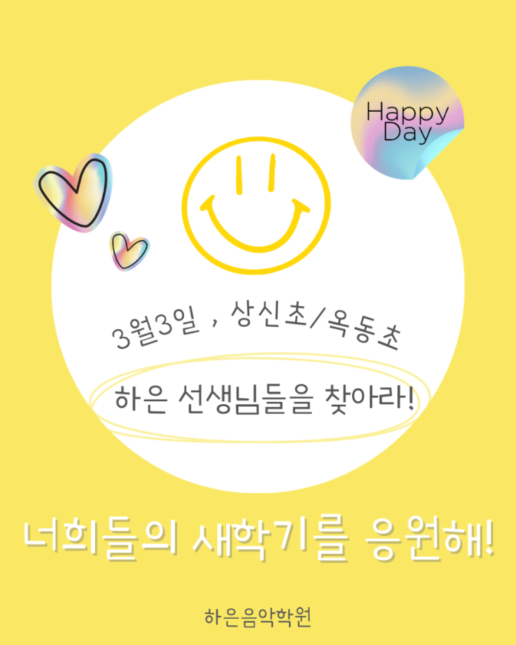 3/3(화) 입학식,개학식 날, '학교 앞 하은 선생님을 찾아라!' 안녕하세요, 하은음악학원입니다. 드디어 내일은 설레는 새 학기 시작이자 입학식 날입니다! 우리 하은 친구들의 소중한 첫걸음을 응원하기 위해, 선생님들이 정성껏 준비한 깜짝 간식 선물을 들고 학교 앞으로 출동합니다. 일시 및 장소 일시: 3월 3일(화) 오전 8시 ~ 10시 장소: 상신초 정문 앞 / 옥동초 후문 앞 (서전중 맞은편) ✅️내일 아침 학교 앞에서 선생님을 만나면 반갑게 인사해 주세요! 우리 친구들이 씩씩하게 등교할 수 있도록 준비한 '응원 간식 선물'을 나눠줄게요. ✅️학부모님을 위한 나눔 입학식에 오시는 신입생 및 재원....... <img src="https://blogthumb.pstatic.net/MjAyNjAzMDJfOTcg/MDAxNzcyNDUyNDk1ODA5.IAleLj1ne65iAeeG1XVJiCBEVrqD_t51b9P-DZXOcwUg.rvZaATA3w8awwPWhvdTreQ7BNAgb7zDgHEMoO4_-2ZIg.PNG/900%A3%DF3%BF%F93%C0%CF_%2C_%BB%F3%BD%C5%C3%CA%A3%DF%BF%C1%B5%BF%C3%CA%A3%DF20260301%A3%DF221904%A3%DF0000.png?type=s3" />
