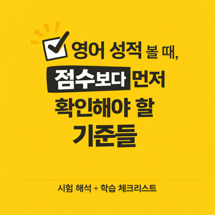 영어 성적을 확인할 때 가장 먼저 보는 것은 보통 점수입니다. 그러나 같은 점수라도 학습 상태는 학생마다 다를 수 있습니다. 이 글에서는 영어 성적을 보다 객관적으로 이해하기 위해 점수 외에 함께 확인하면 도움이 되는 기준들을 정리합니다 . 1️⃣ 시험 점수는 결과 지표일 뿐, 학습 상태를 모두 설명하지는 않습니다 시험 점수는 학습의 ‘결과’입니다. 하지만 결과만으로는 다음과 같은 요소를 알기 어렵습니다. 어떤 유형의 문제에서 점수가 깎였는지 실수인지, 개념 부족인지 시간 관리 문제인지, 이해의 문제인지 따라서 성적을 해석할 때는 점수 자체보다 점수가 만들어진 과정을 함께 살펴볼 필요가 있습니다. 2️⃣ 오답은 개수....... <img src="https://blogthumb.pstatic.net/MjAyNjAxMDNfMzAg/MDAxNzY3NDE3ODE2NDEy.AjYC5mZrkcKyHdGUV5Yhvhy-GRi0NX08jb38cPJVg78g.PCdteOsbBalNGHDWrTNADn6BWMvsG5Ua83UG_V7EfKgg.PNG/ChatGPT_Image_2026%B3%E2_1%BF%F9_3%C0%CF_%BF%C0%C8%C4_02_23_21.png?type=s3" />