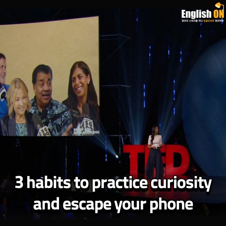 안녕하세요, 안산 고잔동 영어전문학원 잉글리쉬온입니다. 이 시간에는 3 habits to practice curiosity and escape your phone (스마트폰을 잠시 내려놓고 호기심을 키우는 3가지 습관)이라는 주제의 영어 강연을 함께 살펴보면서 실생활 영어 표현도 배워보겠습니다. 강연에서는 디지털 시대를 살아가는 우리에게 필요한 호기심과 인간관계, 그리고 오래된 습관의 중요성을 이야기합니다. 스마트폰에서 잠시 벗어나 생각을 확장해 볼 수 있도록 강연 속 표현과 문장들을 하나씩 풀어 설명해 드릴게요! TED로 배우는 고급영어 3 habits to practice curiosity and escape your phone 스마트폰을 잠시 내려놓고 호기심을 키우는 3가지 습관 by 안....... <img src="https://blogthumb.pstatic.net/MjAyNjAzMDlfMjA2/MDAxNzczMDYwNTk2Mzc0.XgHkC0KgfE0YLitb0zwqlt8aRubYZcGFZuknT3eIY6Yg.fC9zjmhtuSgmmpiAsiIsuUGU_yTxj0_vhKncxD7YVQ0g.JPEG/001.jpg?type=s3" />