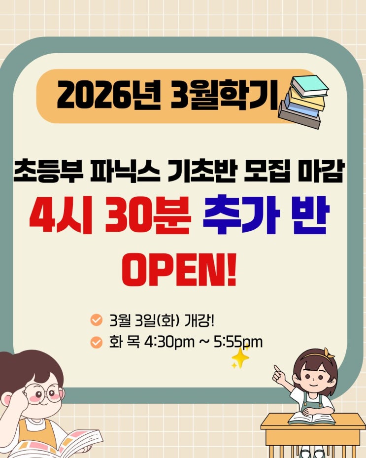 파닉스 기초반 전원 마감 감사합니다! 학부모님들의 뜨거운 관심으로 기초반이 모두 마감되었습니다. 추가 문의가 많아 ✔️ 한 반 더 개설 결정! 기초를 탄탄하게 다지는 마지막 기회, 이번 추가 모집이 진짜 마지막입니다. 서두르세요! <img src="https://blogthumb.pstatic.net/MjAyNjAyMjVfNDAg/MDAxNzcyMDAxNDc2MzI0.vUUfLC21CtR9YCgZSDzqEUE-vz-F2Em-Yf44uELIVYwg.lUlViRXYlicF4lPZ508y4gN-bG2Nb6IOOCP2InTBJRMg.JPEG/%B3%EB%B6%FB_%BD%C9%C7%C3%C7%D1_%C0%CF%B7%AF%BD%BA%C6%AE%B7%B9%C0%CC%BC%C7_%BD%C5%C7%D0%B1%E2_%B4%EB%BA%F1_%BF%B5%BE%EE%C7%D0%BF%F8_%B8%F0%C1%FD_%C0%CE%BD%BA%C5%B8%B1%D7%B7%A5_%C6%F7%BD%BA%C6%AE_%286%29.jpg?type=s3" />