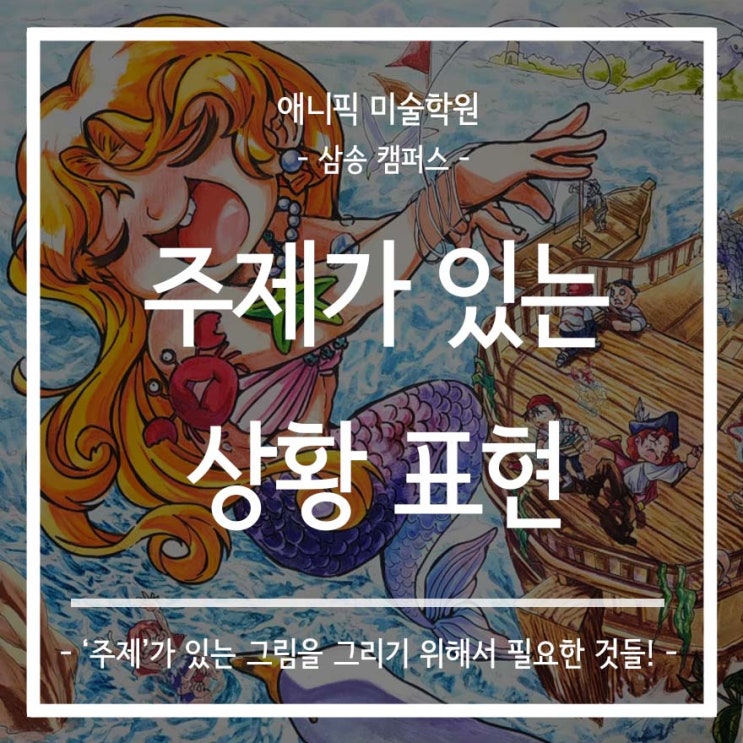 안녕하세요~ 삼송 고양시 미술학원 / 신원 만화 애니 학원 애니픽 미술학원 삼송점입니다! 이제 곧 개학을 앞두고 있는데요~ 우리 친구들 새 학기라서 걱정되기도, 설레기도 할 것 같아요! ♥ 모두 화이팅 ♥ 이번 시간에는 <주제가 있는 상황표현>을 진행했는데요~ 그림에 '주제'가 있다면 이에 대해 표현해 주어야 합니다. 그러기 위해서는 다양한 장치들을 넣어주면 되는데요~ 그림을 살펴보면서 더 자세하게 설명하도록 하겠습니다! 이번 그림의 주제는 '고기를 낚아올리는 낚시꾼'입니다. 한 번 상황을 살펴볼까요~ 배에서 낚시를 하고 있네요. 그런데 건져 올려진 건 물고기가 아니라, 인어공주입니다! 보기만 해....... <img src="https://blogthumb.pstatic.net/MjAyNjAyMjZfMjU0/MDAxNzcyMDg0MDg0NTAz.TTitAdoAXhfQqECEAI8OCmgkfHms2-tkfJKhRp5xubkg.dapXkFjGozhMFgp959IklFAA7sOVDmaLpM7R_RZfV4Mg.JPEG/0226_%B4%EB%C7%A5%C0%CC%B9%CC%C1%F6.jpg?type=s3" />
