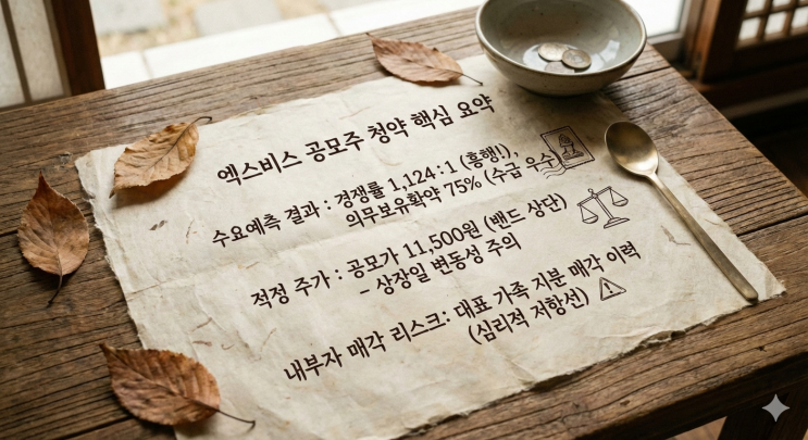 2026년 2월 최대어 엑스비스 공모주 청약 전 반드시 확인해야 할 수요예측 결과와 적정 주가, 내부자 매각 리스크 등 수익 직결 포인트 3가지를 정리해 드립니다. 엑스비스 공모주, 1124:1 흥행 뒤에 숨은 실전 수익 전략 2026년 상반기 IPO 시장의 기대주인 엑스비스(Exvis) 청약이 시작되었습니다. 기관 수요예측에서 1,124.21대 1이라는 압도적인 경쟁률을 기록하며 공모가가 밴드 상단인 11,500원으로 확정되었지만, 투자자들은 단순히 흥행 지표만 보고 진입하기보다 의무보유확약 비율과 내부 지분 이슈를 냉철하게 분석해야 합니다. 엑스비스 공모주의 핵심 수익 구간과 리스크 관리 방법을 2026년 시장 기준으로 총정리합니다. 엑스비스....... <img src="https://blogthumb.pstatic.net/MjAyNjAyMjNfODEg/MDAxNzcxODEzMzA1NTU3.7SczyzS83X2PfrkHP6o1kWllEKHxjf9rd8lcGUBRML8g.ApC1pUfttzJYPD--GkzAnxutEoKps0P7yMNfu8F7ZYMg.PNG/%BF%A2%BD%BA%BA%F1%BD%BA_%B0%F8%B8%F0%C1%D6%2C_11241_%C8%EF%C7%E0_%B5%DA%BF%A1_%BC%FB%C0%BA_%BD%C7%C0%FC_%BC%F6%C0%CD_%C0%FC%B7%ABGemini_Generated_Image_3444g3444g3444g3.png?type=s3" />